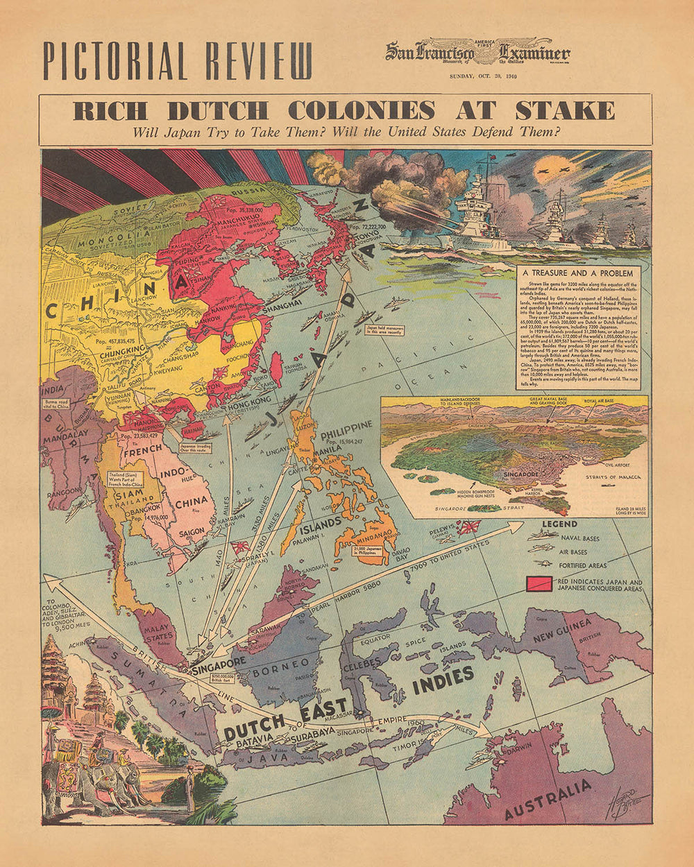 Embarquez pour un voyage historique avec la carte "Rich Dutch Colonies at Stake", une représentation vivante des tensions géopolitiques et des intérêts coloniaux au début du 20ème siècle. Créée par Howard Burke pour le San Francisco Examiner le 20 octobre 1940, cette carte est un chef-d'œuvre de cartographie picturale, capturant un moment où le monde se tenait au bord d'un conflit généralisé. En tant que plus ancien journal publié en continu à San Francisco, l'Examiner a fourni à ses lecteurs des analyses perspicaces à travers un tel récit visuel captivant. Cette carte, en particulier, sert de fenêtre sur les complexités de l'époque, illustrant l'importance stratégique des Indes néerlandaises et la menace imminente de l'expansion japonaise.
