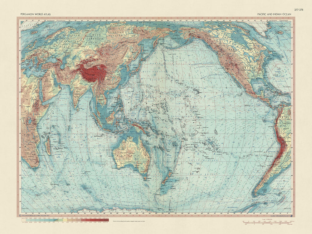 Cette carte de 1967 du Pacifique et de l'océan Indien, produite par le service topographique de l'armée polonaise, est une carte politique et physique détaillée du monde. La carte est centrée sur les océans Pacifique et Indien et montre les continents Amérique du Nord, Amérique du Sud, Afrique, Europe, Asie et Australie. L'Antarctique est également représenté, mais il n'est pas étiqueté.
