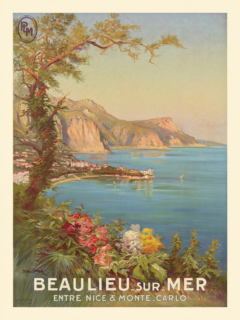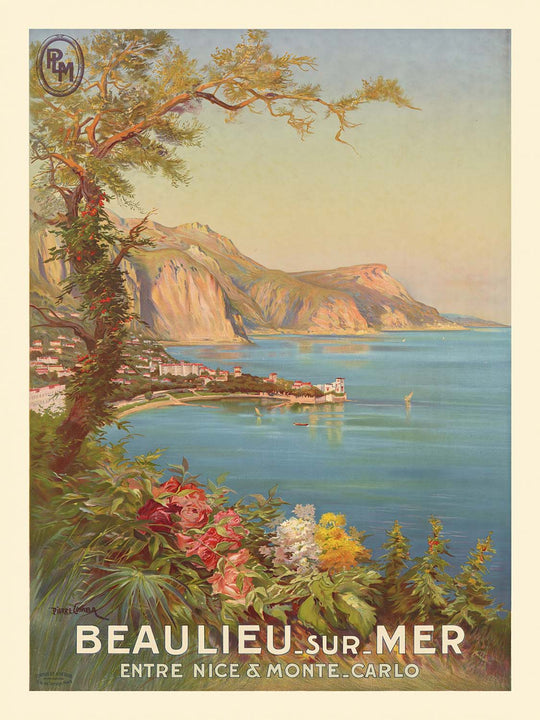P. L. M. Beaulieu sur mer by Pierre Comba captures the sunlit enchantment of the French Riviera at the dawn of modern tourism. Created in 1920 for the famed P.L.M. railway, the poster invites travelers to Beaulieu-sur-Mer, a jewel nestled between Nice and Monaco. Comba channels the lingering spirit of the Belle Époque—romance, ease, and seaside glamour—into a view where sweeping coastline, floral foregrounds, and distant, rugged mountains converge in a scene of unhurried leisure. Lithographic color and crisp, elegant lettering transform the landscape into an irresistible promise of Mediterranean escape.