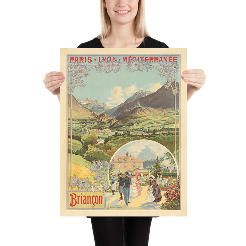 Created in 1901 at the height of the Belle Époque, Paris-Lyon-Méditerranée. Briançon by Louis Trinquier-Trianon invites the viewer to the sunlit embrace of the French Alps. This Art Nouveau travel poster celebrates Briançon—France’s lofty, fortified mountain town—through flowing lines, floral ornament, and a poised tableau of elegant holidaymakers. Designed for the famed PLM railway, the composition fuses natural grandeur with the optimism of modern travel, when new rail links made alpine air, dramatic valleys, and historic ramparts accessible to a wider public.