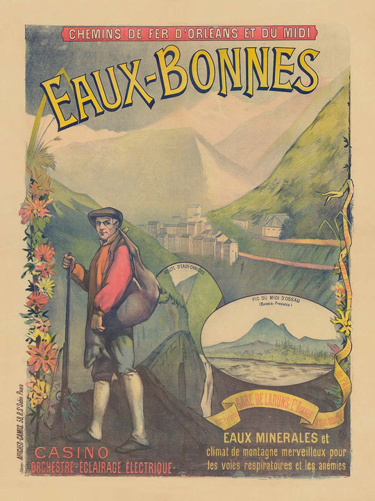 Chemins de Fer d’Orléans et du Midi. Eaux-Bonnes. Eaux minérales et climat de montagne. Casino by Imp. Camis, 1892, celebrates the Belle Époque allure of Eaux‑Bonnes in the French Pyrenees. Printed in Paris by the renowned lithographic house “Affiches Camis,” this poster promoted easy rail access to the spa town famed for its restorative air and mineral springs near Pau. In the design, bold lemon‑yellow lettering for “EAUX‑BONNES” crowns a sweeping mountain vista, while a beret‑wearing mountain guide in a coral‑red smock pauses before the valley. An oval vignette clearly labels the dramatic “PIC DU MIDI D’OSSAU (BASSES‑PYRÉNÉES),” and a yellow ribbon curls with route notes including “de PAU une heure” and “GARE DE LARUNS (E. BONNES).” At the base, the poster proudly announces “CASINO — ORCHESTRE — ÉCLAIRAGE ÉLECTRIQUE,” alongside the promise: “EAUX MINÉRALES et climat de montagne merveilleux pour les voies respiratoires et les anémies.”