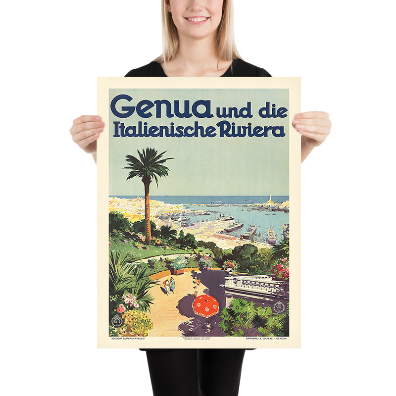 This poster captures a pivotal moment when railways and ocean liners opened the Riviera to a broader public. Genua celebrates Genoa’s unique character: terraced hillsides tumbling toward a deep natural harbor; promenades fringed with lush greenery; and an urbane seaside lifestyle that promised sunshine, elegance, and effortless mobility. Issued during the optimistic 1920s–30s travel boom, it embodies the spirited marketing that helped define Mediterranean tourism for generations.