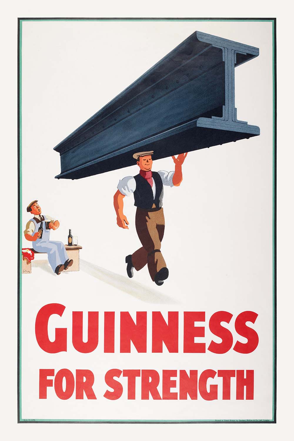 L'affiche "Guinness for Strength" est renommée pour son imagerie audacieuse et engageante et son style instantanément reconnaissable. L'expression rayonnante du constructeur et son exploit de force exagéré, associés à la typographie claire et angulaire du slogan, créent une composition à la fois visuellement frappante et délicieusement fantaisiste. L'attrait durable de l'affiche réside dans sa capacité à évoquer la nostalgie tout en restant fraîche et pertinente - un témoignage de la sensibilité de design magistrale de Gilroy.