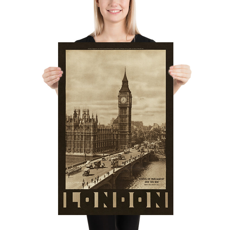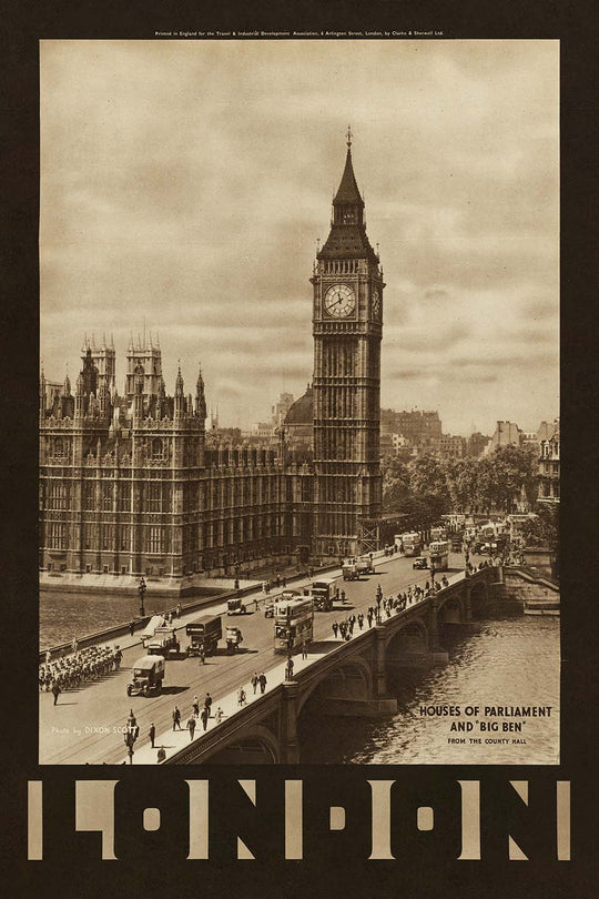 Houses of Parliament and ‘Big Ben’ – London by Dixon Scott invites you to linger on one of the world’s most recognisable skylines: the Gothic Revival silhouette of the Palace of Westminster rising over the River Thames, crowned by the clock tower popularly known as Big Ben. Blending early 20th‑century photography with the streamlined sensibilities of Art Deco graphic design, this antique travel poster captures London at its most dignified—modern, metropolitan, and proud of its architectural grandeur. The sepia atmosphere, at once warm and romantic, frames the city as both historic landmark and living capital.