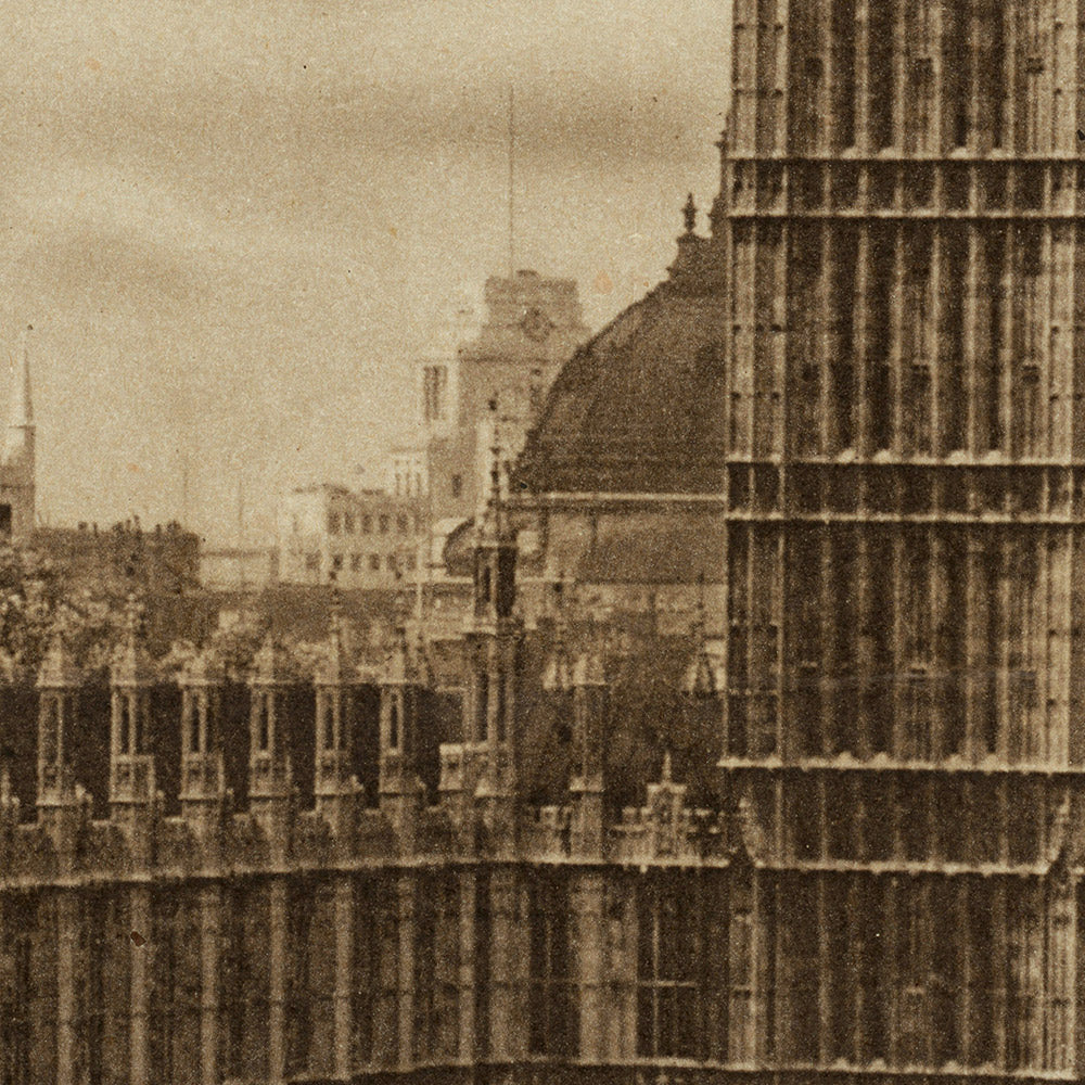 What makes this piece so compelling is the harmony of tone and geometry. A palette of beige, brown, and black—true sepia—creates an enveloping warmth that flatters modern interiors, while the tower’s verticals and the Parliament’s lace‑like tracery provide crisp structure. The soft‑focused sky adds dimension, and the interplay between linear stone detail and the river’s organic curves gives the image a poised, timeless rhythm. Subtle Art Deco sensibilities—pared‑back graphics, clear hierarchy, and a restrained elegance—turn a photograph into a classic poster that reads as both artwork and artifact.