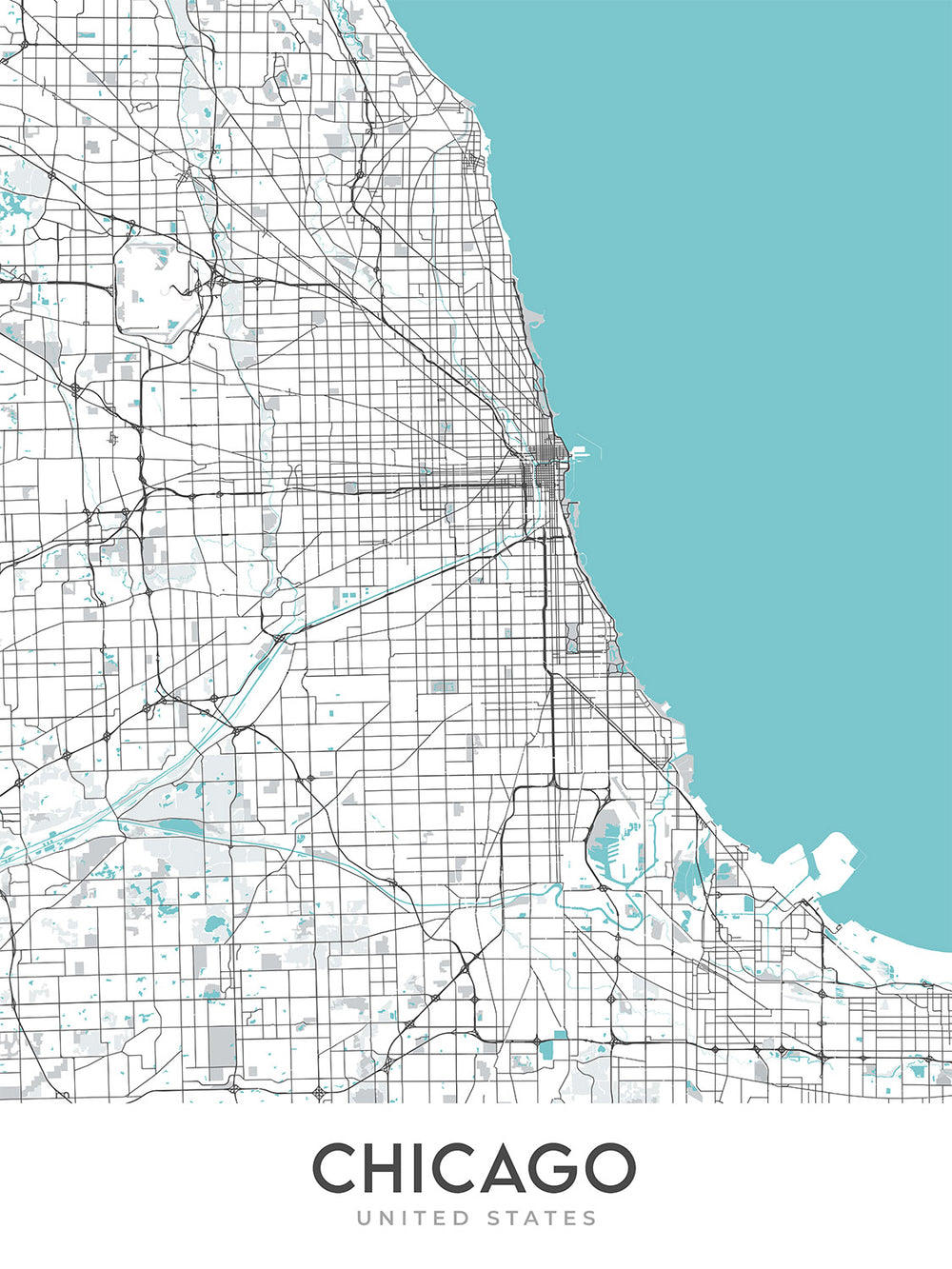 La carte englobe une vaste région, s'étendant sur environ 66 miles de haut en bas et 56 miles de gauche à droite. Dans cette vaste zone, elle capture l'essence des quartiers vibrants de Chicago, chacun avec son caractère et son charme distincts. Parmi les quartiers notables, on trouve West Town, Ukrainian Village, Humboldt Park, Logan Square, Bucktown, Wicker Park, Lincoln Park, Old Town, River North, The Loop, Near West Side, Near South Side, South Loop, Chinatown, Pilsen, Little Italy, Bridgeport, Bronzeville, Hyde Park et Kenwood.