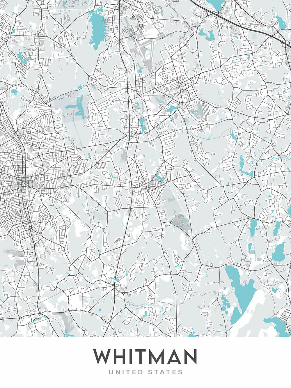Plan de la ville moderne de Whitman, MA : hôtel de ville de Whitman, école secondaire régionale Whitman-Hanson, route 18, route 27, route 106