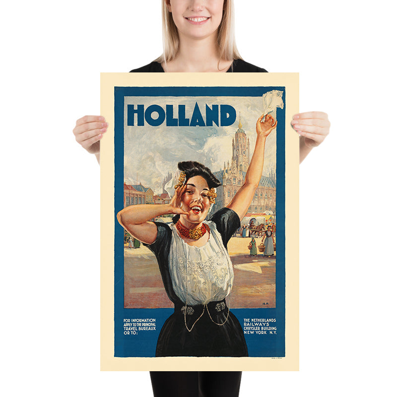 Holland by an unknown poster artist is a joyous slice of early 20th-century travel art, inviting viewers to discover the Netherlands through the charm of traditional culture. Created in the golden age of European tourism, the design pairs an exuberant figure in regional dress with a dignified architectural backdrop, capturing the romance and optimism that fueled journeys across the continent. “Holland” here evokes the spirit of the Dutch coastal provinces and, by extension, the wider Netherlands—an alluring shorthand that travel bureaus and railways often used to entice visitors.