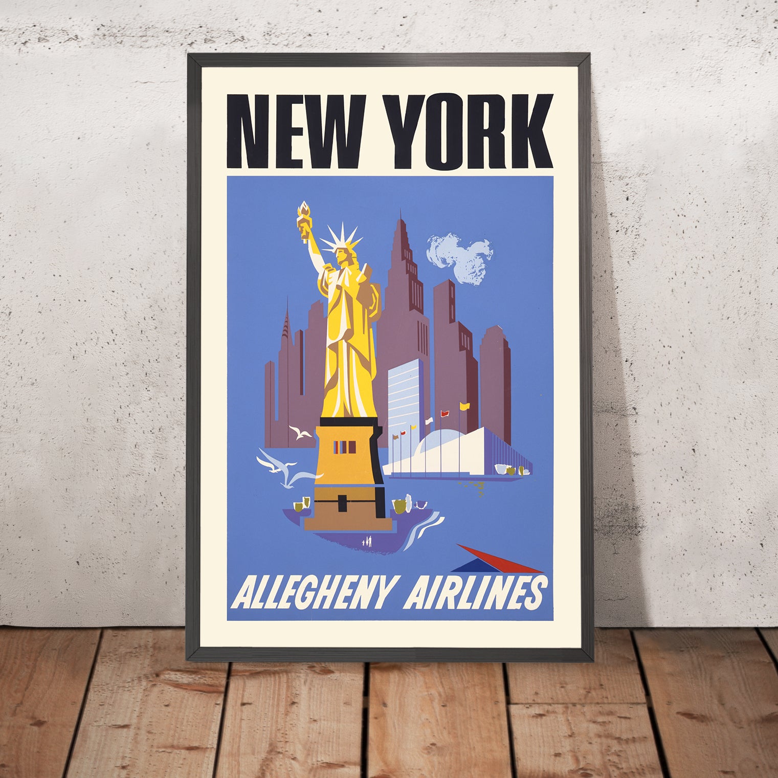 New York – Allegheny Airlines is a mid-century travel poster created by an unknown artist for the airline’s route promotion to New York City, published around 1950. Rendered in the clean, confident language of American modernist graphic design, it captures the post-war optimism that fueled the golden age of flight. A stylized Statue of Liberty rises before a simplified skyline, inviting travelers to experience the energy and promise of America’s most iconic city.