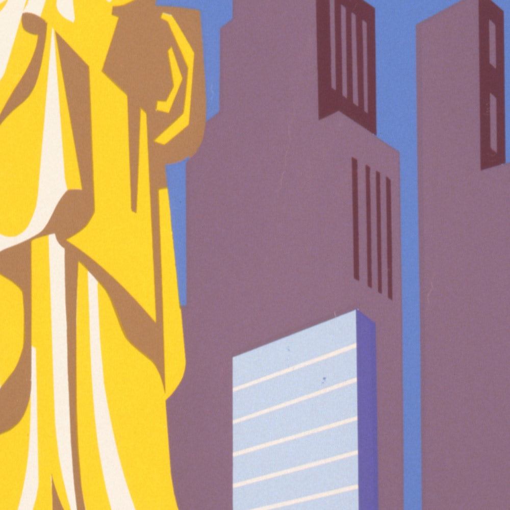 Color and form do the heavy lifting here. A radiant yellow ground suggests daylight and warmth, while deep purples and cool blues provide graphic contrast that reads instantly from a distance—essential for station halls and booking offices. Smooth, simplified contours, restrained detail, and geometric silhouettes deliver clarity and impact. It’s an easy piece to live with: the sunlit yellow enlivens neutral interiors, the purple accents complement navy or charcoal schemes, and the balanced composition suits modern lofts, office walls, and gallery-style hangings alike. For design lovers, aviation enthusiasts, or anyone with a fondness for New York, it’s a timeless conversation starter that brings mid-century charm to contemporary spaces.
