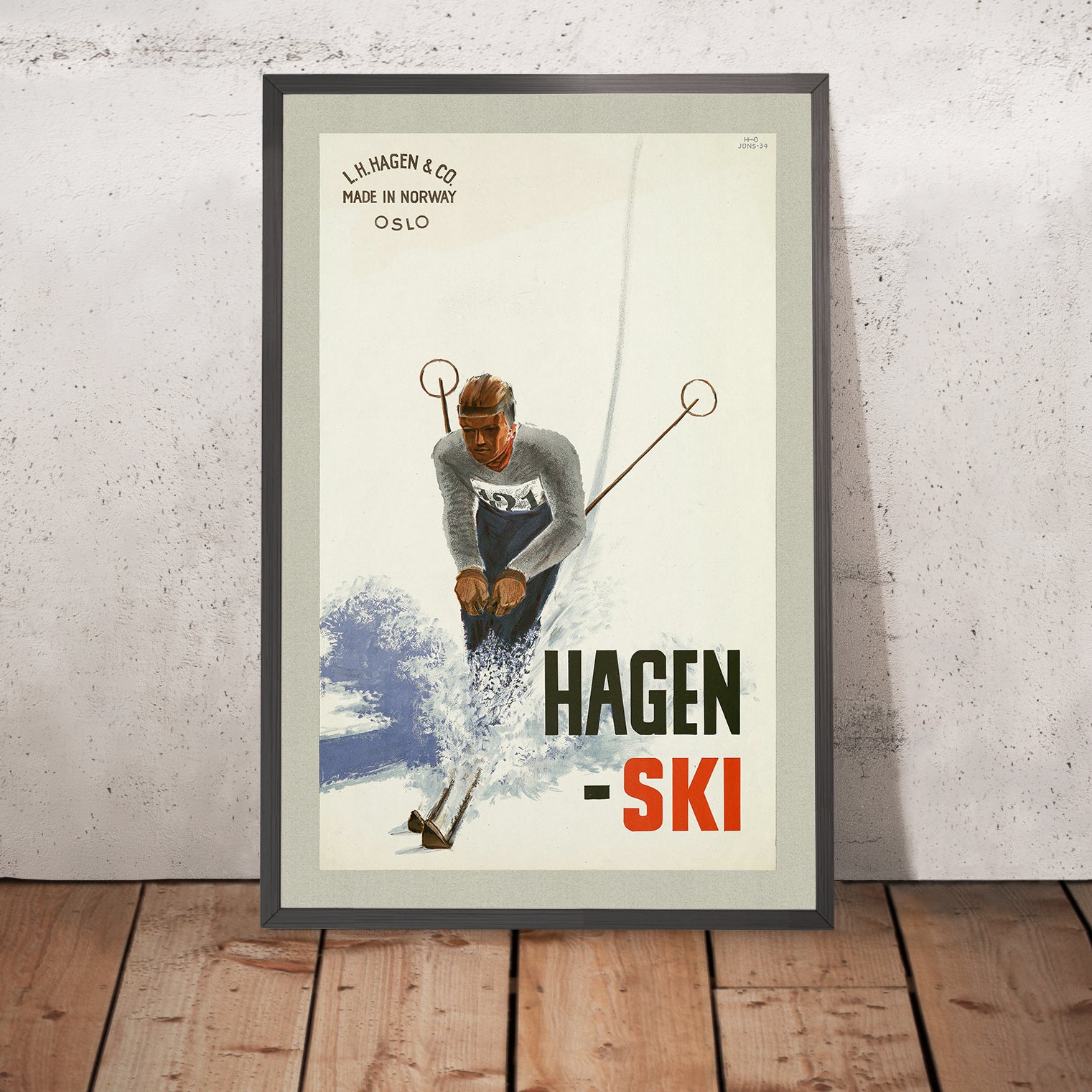 Hagen – ski by Einar Johnsen (1934) is a brisk, modernist celebration of winter sport from the golden age of Scandinavian poster design. Created in the interwar years, when skiing was transforming from a means of travel into a lifestyle and tourism draw, the image captures a skier cutting a dynamic arc across fresh snow. The crisp, sans‑serif headline and streamlined figure signal the confidence of early 20th‑century advertising, while the composition channels the speed, freedom, and national pride bound up with Norway’s snowy peaks and winter culture.
