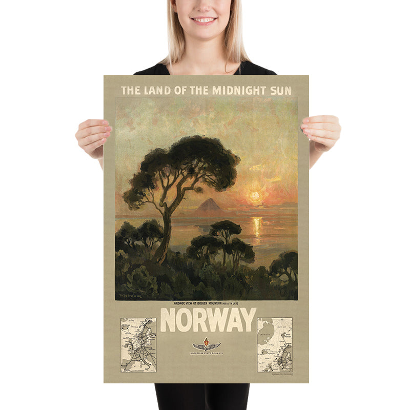 Norway – the land of the midnight sun by Thorolf Holmboe invites you into the glowing hush of a northern summer night, where fjords, forests and distant peaks are washed in a low, everlasting light. Created as a promotional travel poster in the early 20th century, it distills the magic of Norway’s most famous natural phenomenon into a single, luminous vista. Holmboe—Norwegian painter, illustrator, and designer—studied under Hans Gude in Berlin and Fernand Cormon in Paris, and his work spans Naturalism, Neo-romanticism, Realism and Impressionism. He is represented in the National Gallery of Norway, and here he channels that painterly training into a poster that is both evocative artwork and irresistible invitation to explore the North.