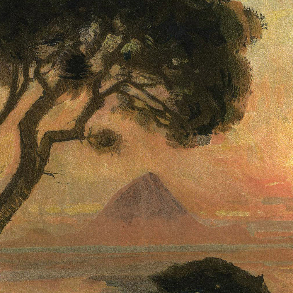 Design and color: dominated by deep greens and warm browns in the headlands and trees, the composition is counterbalanced by a band of orange-gold that melts into gentle blue-greens across water and sky. Holmboe’s loose, deliberate brushwork softens edges and blends the horizon, evoking the slow drift of time under polar light. Organic silhouettes of pines frame a simplified mountain form, a subtle dialogue between Art Nouveau curves and poster-like clarity. The palette and pacing of light make this a striking statement piece—serene, atmospheric, and endlessly livable.