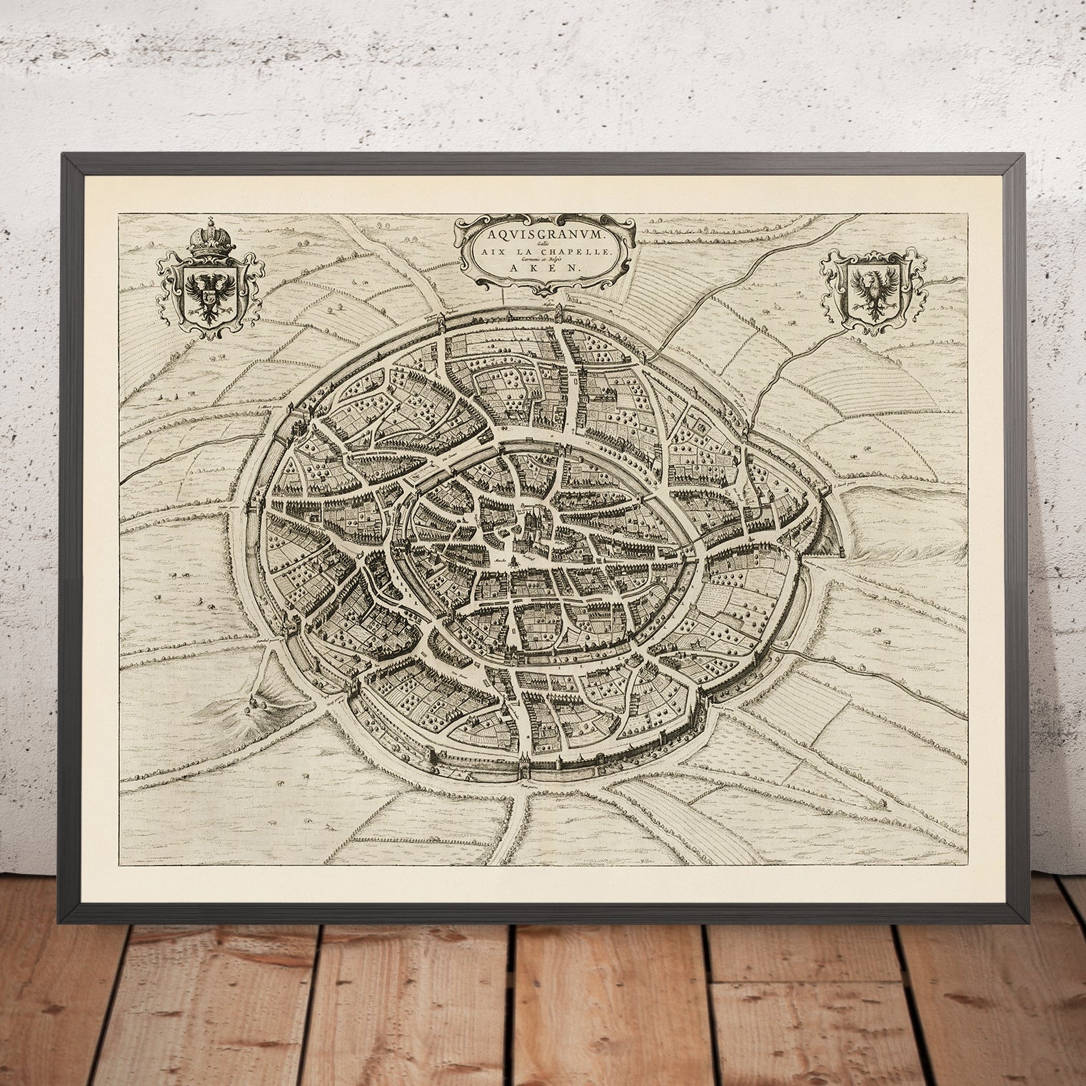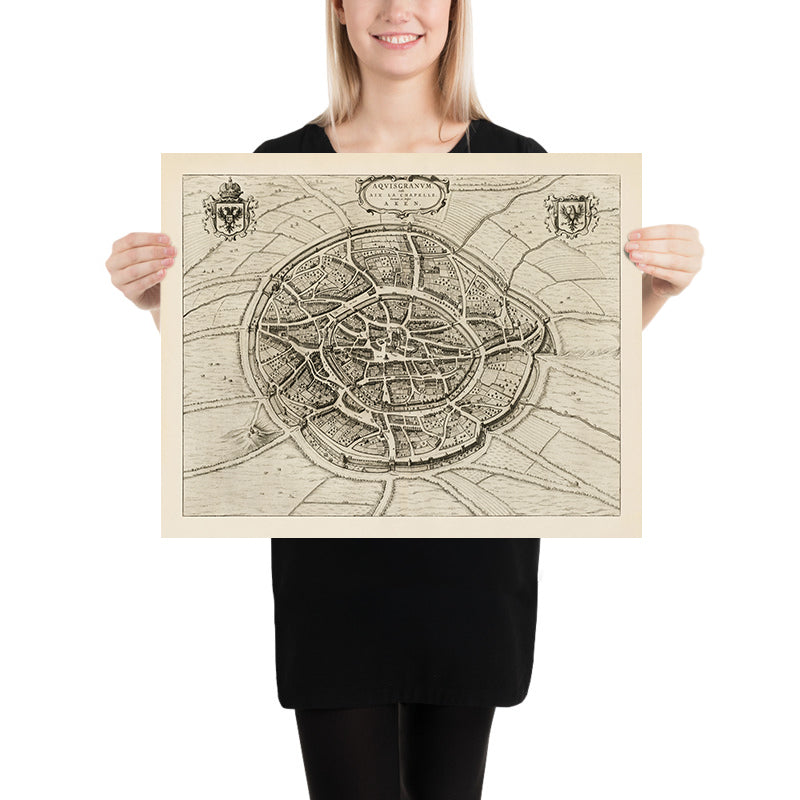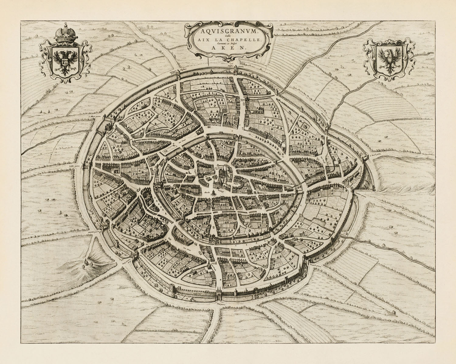 Aquisgranum gallis Aix La Chapelle Germanis ex Belgis Aken is Joan Blaeu’s eloquent 1652 portrait of Aachen, a venerable imperial city known to Latin, French, German, and Dutch speakers alike. Issued in the first Dutch edition of Blaeu’s Toonneel der Steeden, it sets Aachen within the political theater of the Low Countries while celebrating a city that anchored imperial coronations and cross-border trade. As a city map, it excels at showing the lived texture of place: a compact medieval core framed by walls and gates, crowned by soaring ecclesiastical and civic monuments, and ringed by fields and gardens. In a single, elevated view, Blaeu fuses topography, history, and urban order—inviting the eye to wander from the cathedral precinct to the marketplace and beyond the ramparts into the working countryside.