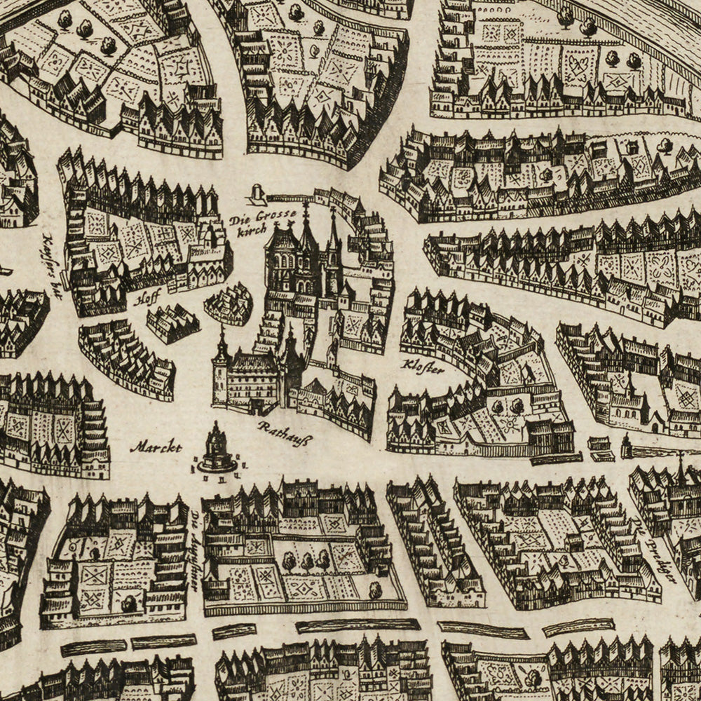 The map’s landmarks tell Aachen’s layered story. The octagonal mass of the Palatine Chapel—today the core of Aachen Cathedral—signals Charlemagne’s legacy and the city’s role as a coronation seat of German kings. Nearby, the Gothic Rathaus rises over the market, emblem of civic autonomy in a free imperial city governed by council and guild. The Wurm’s waters fed cloth-finishing and metalworking, trades that brought wealth to the burghers and are legible here in workshops clustered along canals and millraces. The surrounding thermal landscape, famed since Roman times, underwrote a culture of healing, hospitality, and pilgrimage; Blaeu’s plan situates that urban economy within a mosaic of arable plots and lanes that stitched town to hinterland.