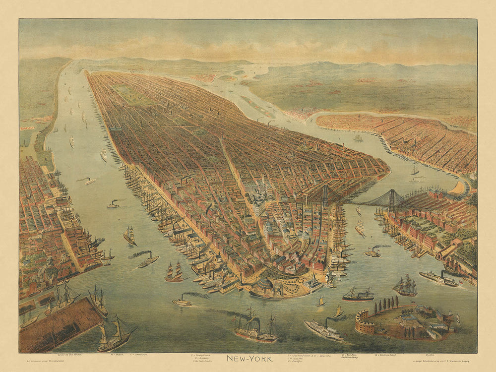 Ancienne carte Birdseye de New York par Wachsmuth, 1898: Broadway, Central Park, Pont de Brooklyn, Île du Gouverneur