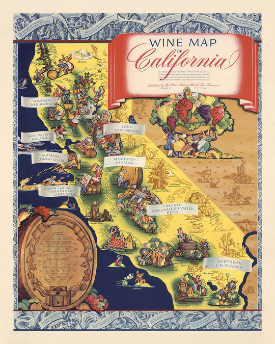 La conception et le style de la carte offrent un aperçu du contexte historique des années 1930, mettant en valeur la renaissance de l'industrie vitivinicole après les années restrictives de la Prohibition. Les illustrations mettent non seulement en valeur les régions géographiques, mais décrivent également les activités culturelles et les traditions associées à la vinification, offrant ainsi une riche tapisserie d'informations et de plaisir visuel. L'approche ludique et informative de la carte en fait un élément précieux pour comprendre le paysage historique et culturel de l'industrie vitivinicole californienne.