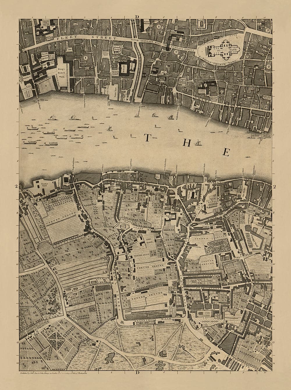 Cette carte a été publiée à l'origine dans 24 feuilles. La carte indiquée ici est la feuille 12, se concentrant sur le tronçon de la Tamise entre Blackfriars et Temple du côté nord (ville de Londres) et Southbank et Banque au sud (Lambeth et Southwark). Avance rapide de 250 ans et vous verriez la Tate Moderne et Royal Festival Hall du côté sud de la rivière. Le côté nord de la rivière est dominé par la cathédrale Saint-Pauls, mais vous pouvez également voir la rue Fleet et Ludgate Hill. «Les escaliers de Blackfriars» et «les escaliers du temple» vous montrent où se trouvaient les stations de métro de jour moderne.