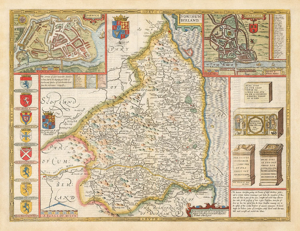 Ancienne carte de Northumberland en 1611 par John Vitesse: Newcastle, Gateshead, Wall de Hadrian, Tyne et Wear