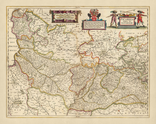 La carte « Picardia vera et inférieure » est plus qu'une simple représentation géographique ; c'est un voyage à travers le temps et l'histoire. Le Parc Naturel Régional Scarpe-Escaut, premier du genre en France, témoigne de l'engagement du pays à préserver sa beauté naturelle. La carte présente également le réseau complexe de voies navigables et de canaux, qui ont joué un rôle crucial dans le commerce et les transports au XVIIe siècle. La représentation détaillée des forêts, des montagnes et d'autres points de repère améliore encore l'attrait visuel de la carte.
