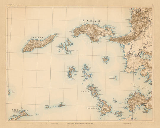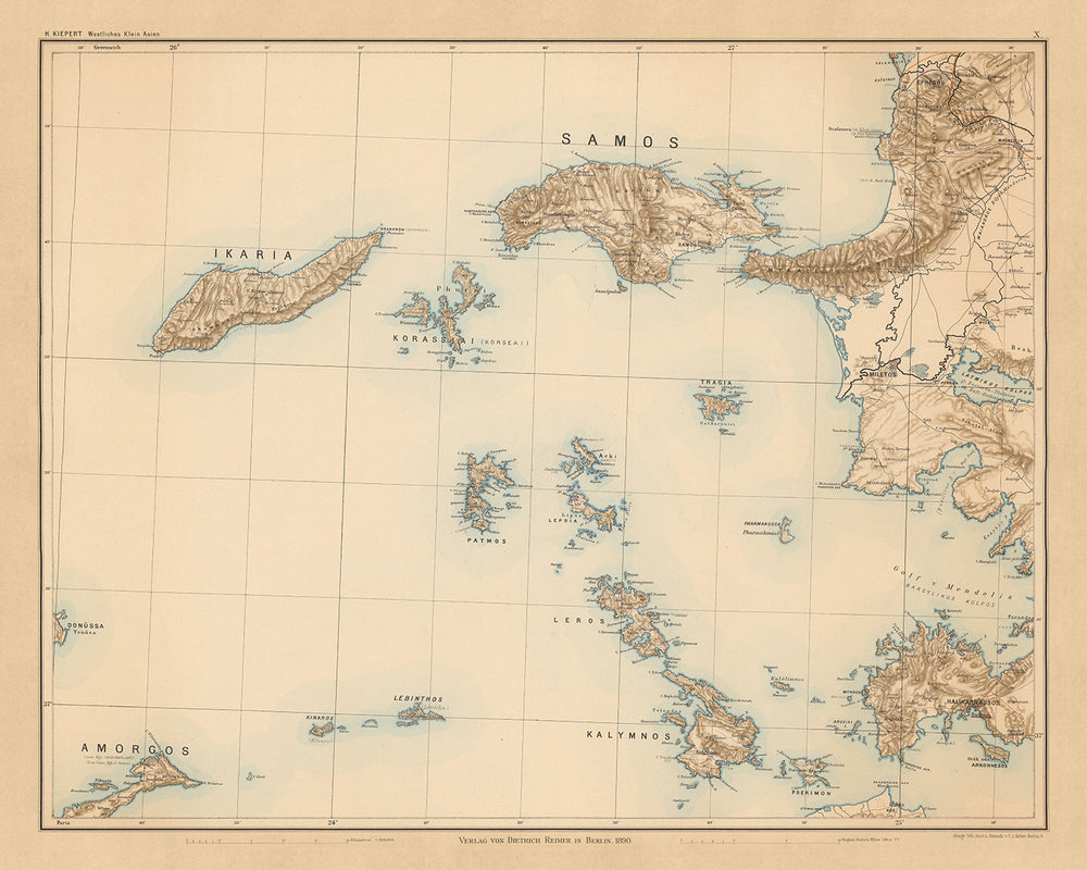 Ancienne carte de Samos et des îles égéennes par Kiepert, 1890: Ikaria, Kalymnos, Fournoi, Éphèse