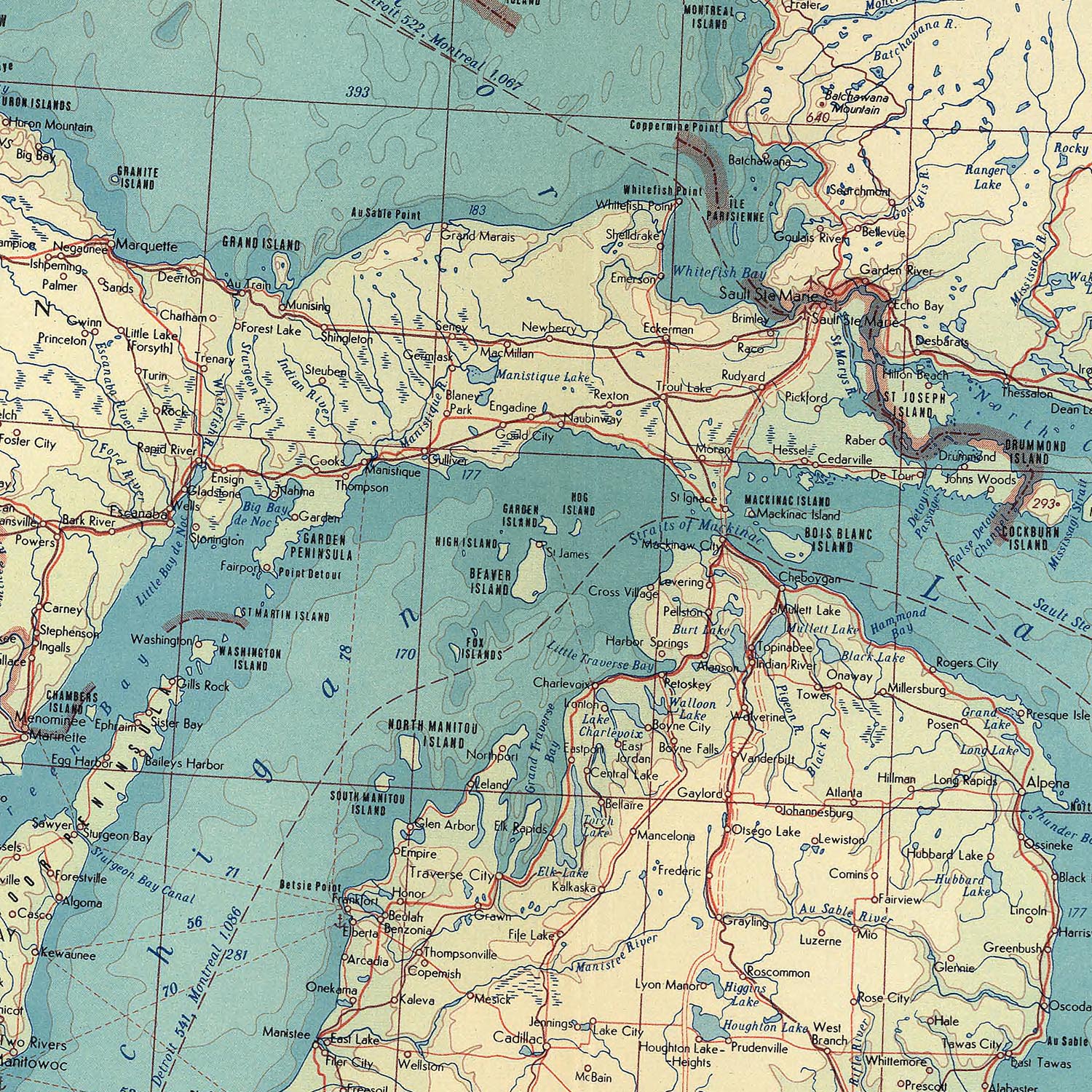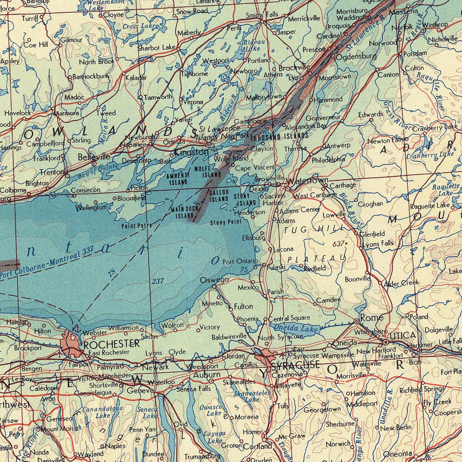 Le lac Huron, réputé pour son archipel d'îles, est un autre point focal de cette carte. La côte complexe du lac et les villes qui se nichent le long de ses rives sont méticuleusement illustrées. Le lac Ontario et le lac Érié, respectivement les plus à l'est et les plus au sud des Grands Lacs, sont également présentés de manière proéminente. Ces lacs, avec leurs ports animés et leurs sites historiques significatifs, jouent un rôle crucial dans le commerce et l'histoire de la région.