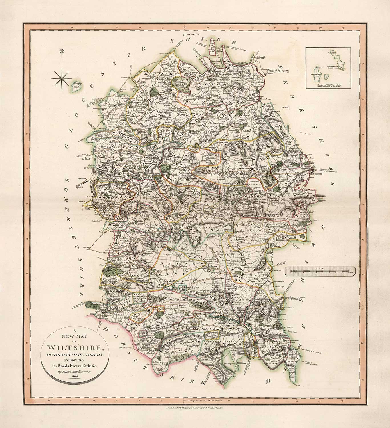 Cette merveilleuse vieille carte du Wiltshire a été publiée à l'origine en 1801. Elle a été créée par John Cary.
