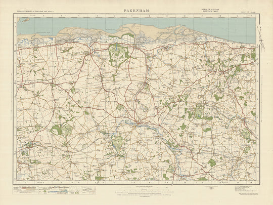 La carte "Sheet 57 - Fakenham" de l'édition "Popular" One-inch de l'Ordnance Survey, Angleterre et Pays de Galles, publiée en 1925, est une pièce remarquable de l'histoire cartographique. Cette carte présente les villes et les caractéristiques intéressantes de Fakenham, Holt, Burnham Market, Little Walsingham, Briston et la région de beauté naturelle exceptionnelle de la côte du Norfolk (AONB).