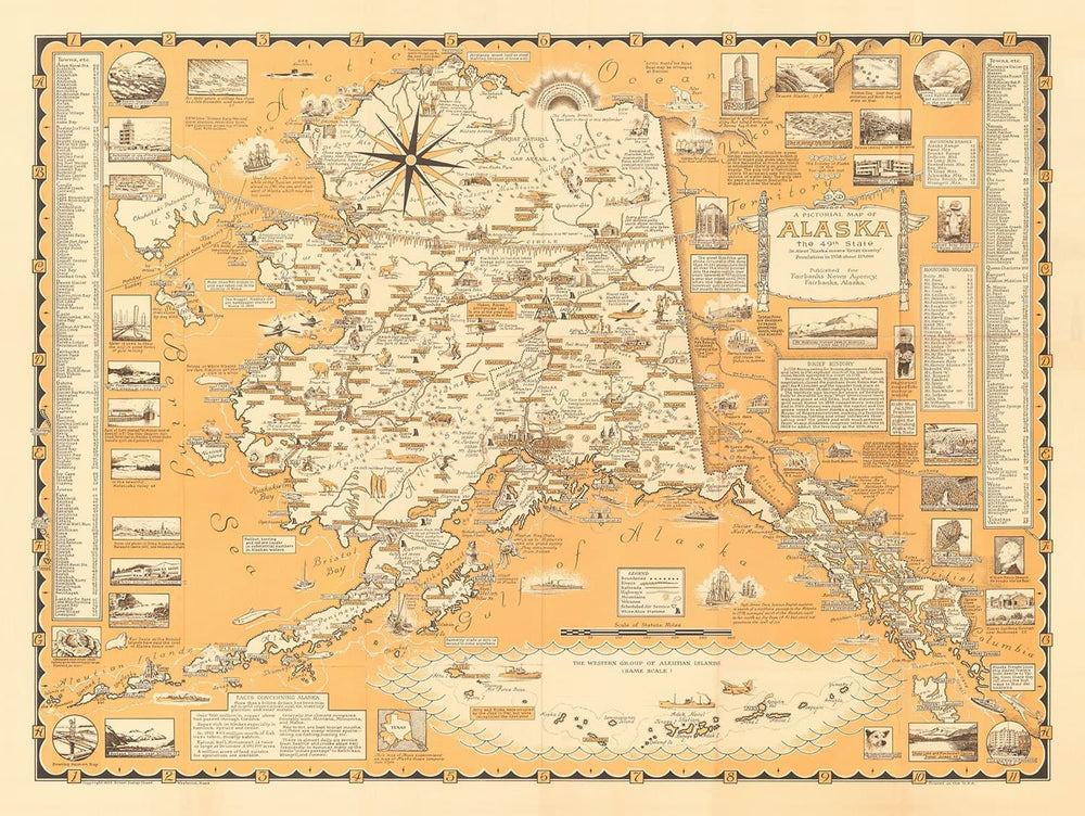 Cette carte illustrée par Earnest Dudley Chase montre une carte picturale très détaillée de l'Alaska en 1958. Vous ne trouverez vraiment pas de carte plus détaillée ou intéressante de l'Alaska. Il y a même une boîte 'faits intéressants sur l'Alaska' en bas à gauche... et une illustration d'un chou (qui apparemment a poussé très gros en Alaska).