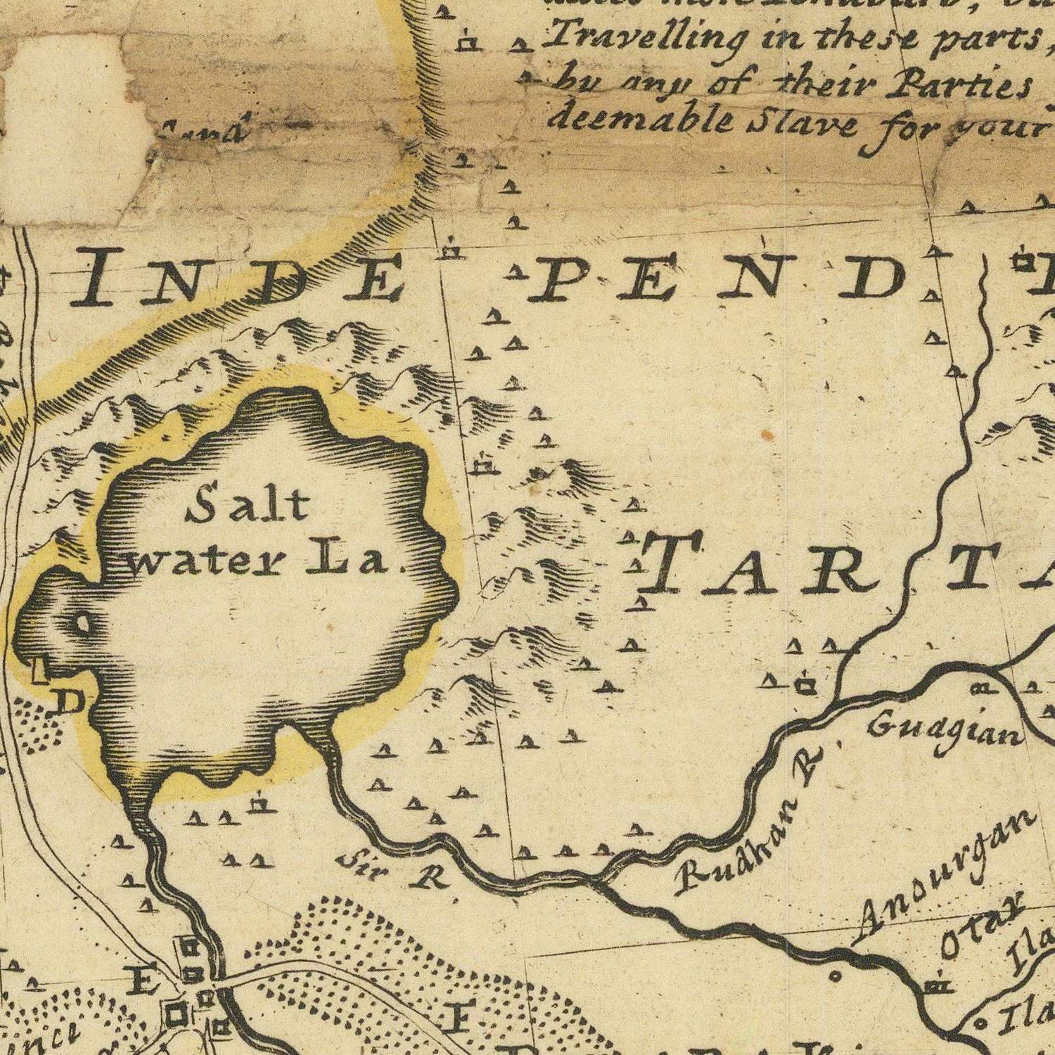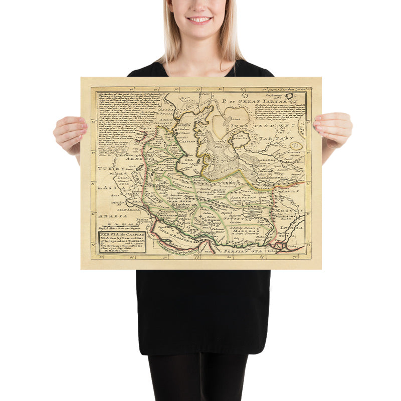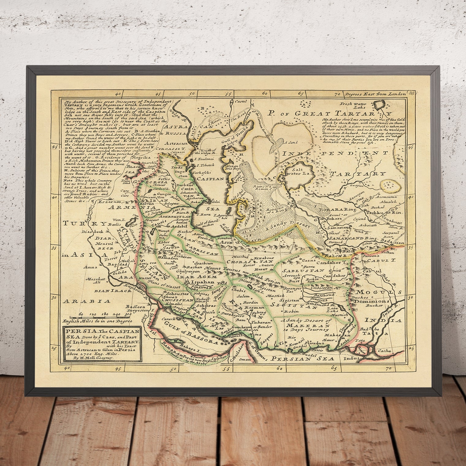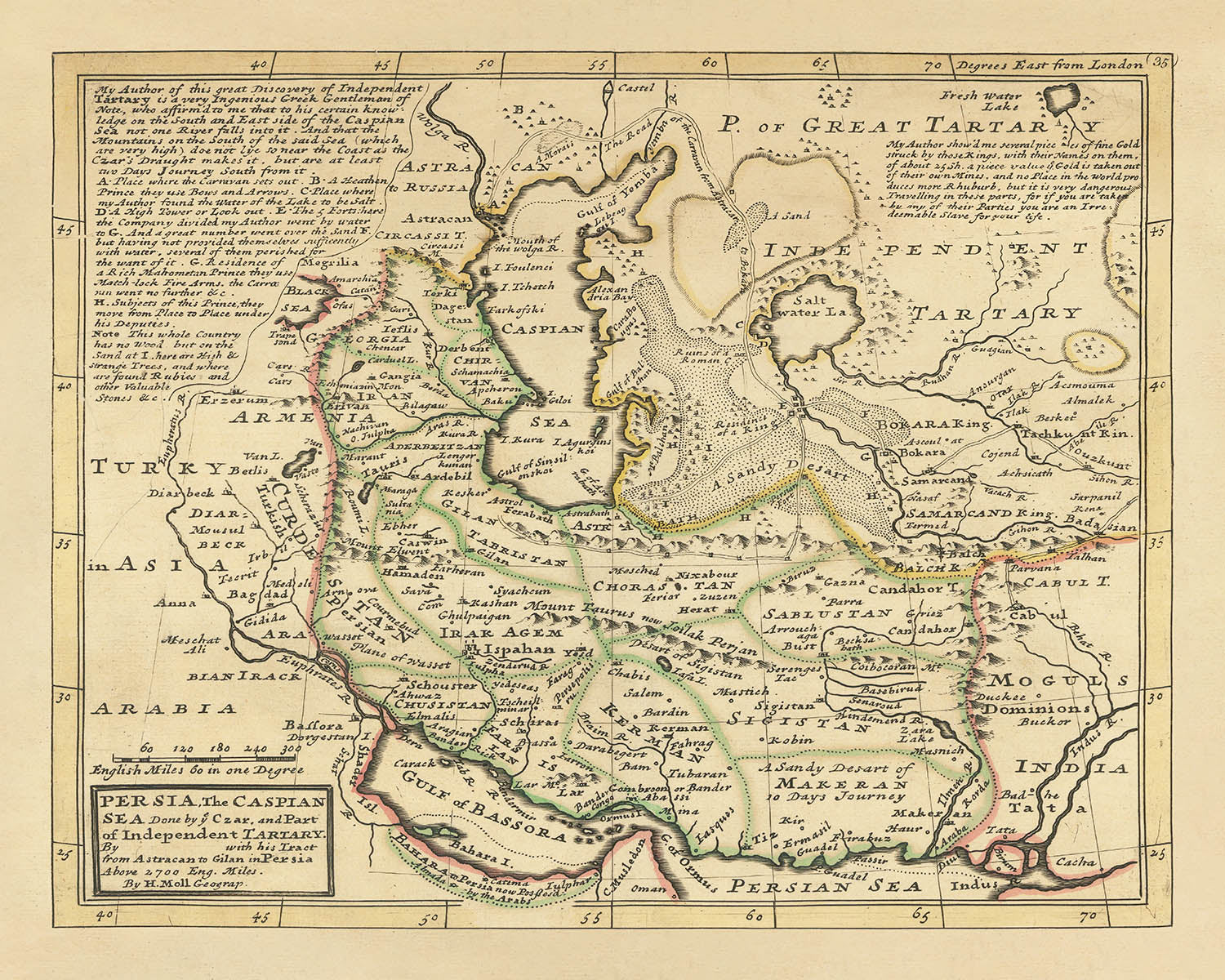Moll marie avec brio cette clarté physique à une trame politique. Des frontières traversent provinces et principautés, tandis que les grands centres de la Perse — Ispahan, Tabriz et la ville montante de Téhéran — ancrent les routes à travers le plateau iranien. Autour de la mer intérieure, Bakou et Derbent rythment le corridor caucasien, tandis qu’Astrakhan couronne le nord en tant que porte d’entrée de la Russie. Le Gilan, soigneusement indiqué, signale la richesse et la sensibilité stratégique de la rive méridionale de la Caspienne. Plus à l’est, la large désignation de « Tartarie indépendante » renvoie aux perceptions européennes des souverainetés mobiles de la steppe. Déserts et hauts plateaux sont nommés et ombrés, les pistes caravanières suggérées par des alignements de villes, si bien que lignes politiques et réalités géographiques se heurtent — les montagnes canalisant les mouvements, les fleuves dictant le commerce, la mer tissant les cultures entre elles.