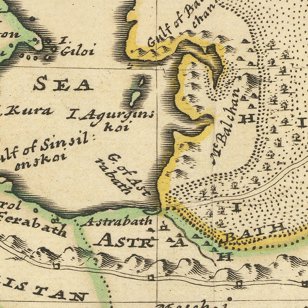 La cadence historique qui sous-tend la gravure est indéniable. Les campagnes caspiennes de Pierre le Grand et ses desseins commerciaux ont poussé la Russie vers la Perse, avec Astrakhan comme base de déploiement et Derbent comme clé des portes du Caucase ; Moll saisit ce tournant à travers un réseau de ports, de forteresses et de frontières. Les routes commerciales s’enroulent d’Ispahan vers Tabriz en direction de la rive occidentale, tandis que Bakou, longtemps réputée pour ses ressources côtières, fait face à la mer que Van Verden avait enfin mesurée avec rigueur. En fixant la véritable forme de la mer Caspienne, la carte réordonne à la fois stratégie et commerce : distances recalculées, dangers cartographiés, opportunités rendues visibles. C’est à la fois un monument de précision et une fenêtre sur les ambitions auxquelles cette précision servait.