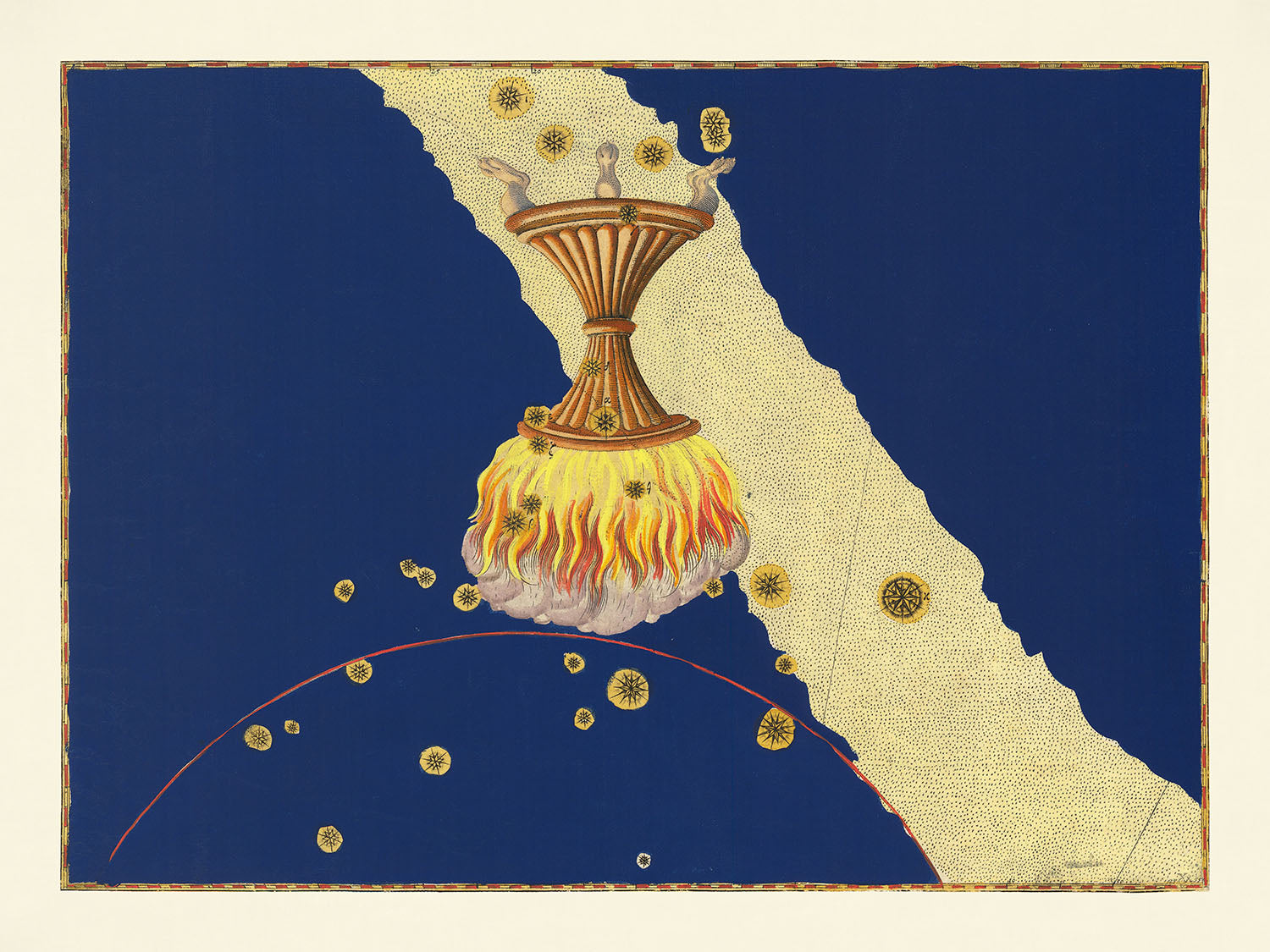 Ara, publiée pour la première fois en 1603, est un exemple frappant de carte céleste en couleur réalisée par Johann Bayer, représentant la constellation Ara. Nichée entre Scorpius et Triangulum Australe, cette ancienne carte des étoiles colorée à la main illustre l'une des 48 constellations grecques décrites par l'astronome Ptolémée du IIe siècle. La carte historique de Bayer, Uranometria, est un atlas céleste emblématique du XVIIe siècle et un précurseur de tous les atlas d'étoiles modernes.