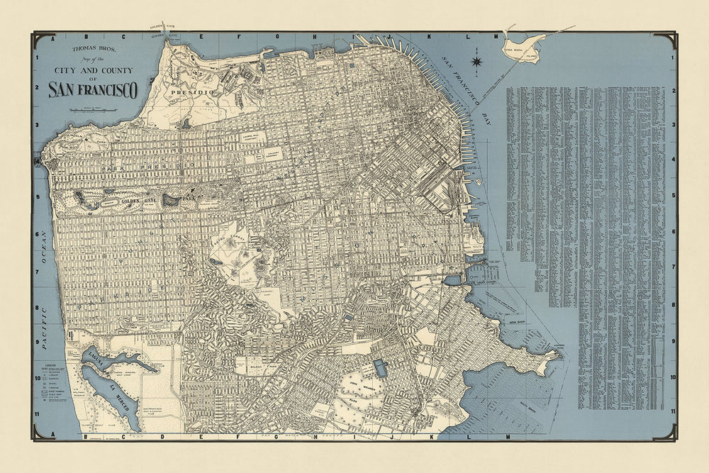 Cette carte de 1938, intitulée 'Ville et Comté de San Francisco', publiée par Thomas Brothers, est un regard détaillé et fascinant sur la ville de San Francisco telle qu'elle existait il y a près d'un siècle. La carte couvre toute la péninsule nord de San Francisco, atteignant aussi loin au sud que le parc McLaren et le lac Merced, et inclut le célèbre pont du Golden Gate, qui venait d'être achevé et est affiché en haut de la carte.