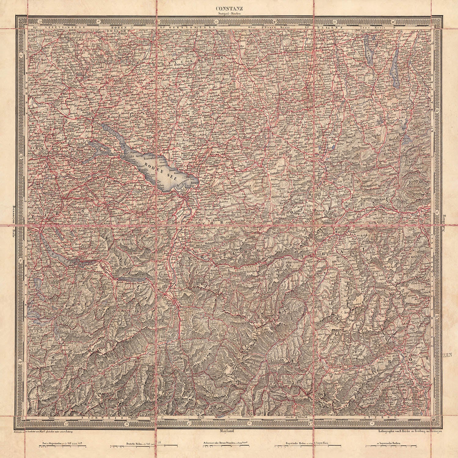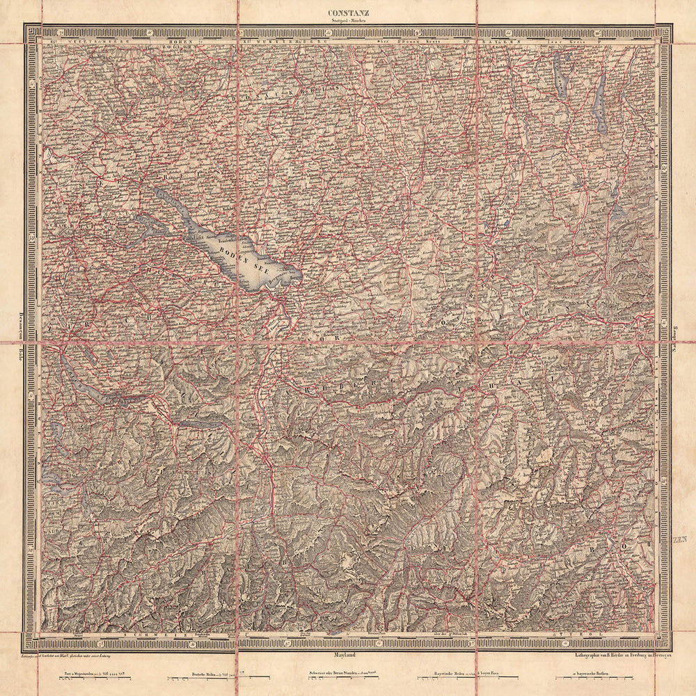 Woerl’s mastery lies in his early, assured use of two-color lithography. A red lithographic stone, overlayed with exceptional precision, brings instantaneous legibility to roads, emerging railways, and political separations, while black delineation does the work of names, contours, and hydrography. Relief is modeled with disciplined hachures that render the Black Forest’s serried slopes and the Alps’ approaching buttresses with tactile nuance. Bathymetric engraving gives Bodensee a living contour, echoing the passage of the Rhine across the basin. This modern printing sensibility—spare, functional, and beautiful—explains the map’s esteem among contemporary users and its later adoption by the German army, which prized such clarity for planning and reconnaissance.