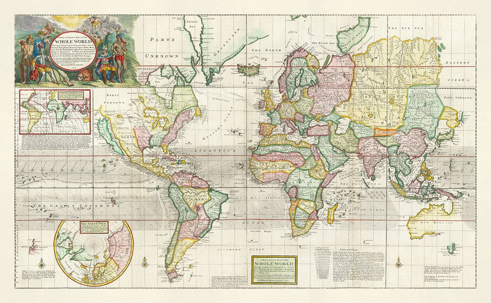 Carte mondiale ancienne à partir de 1719 par Herman Moll: Grand tableau Atlas Colonial & Exploration