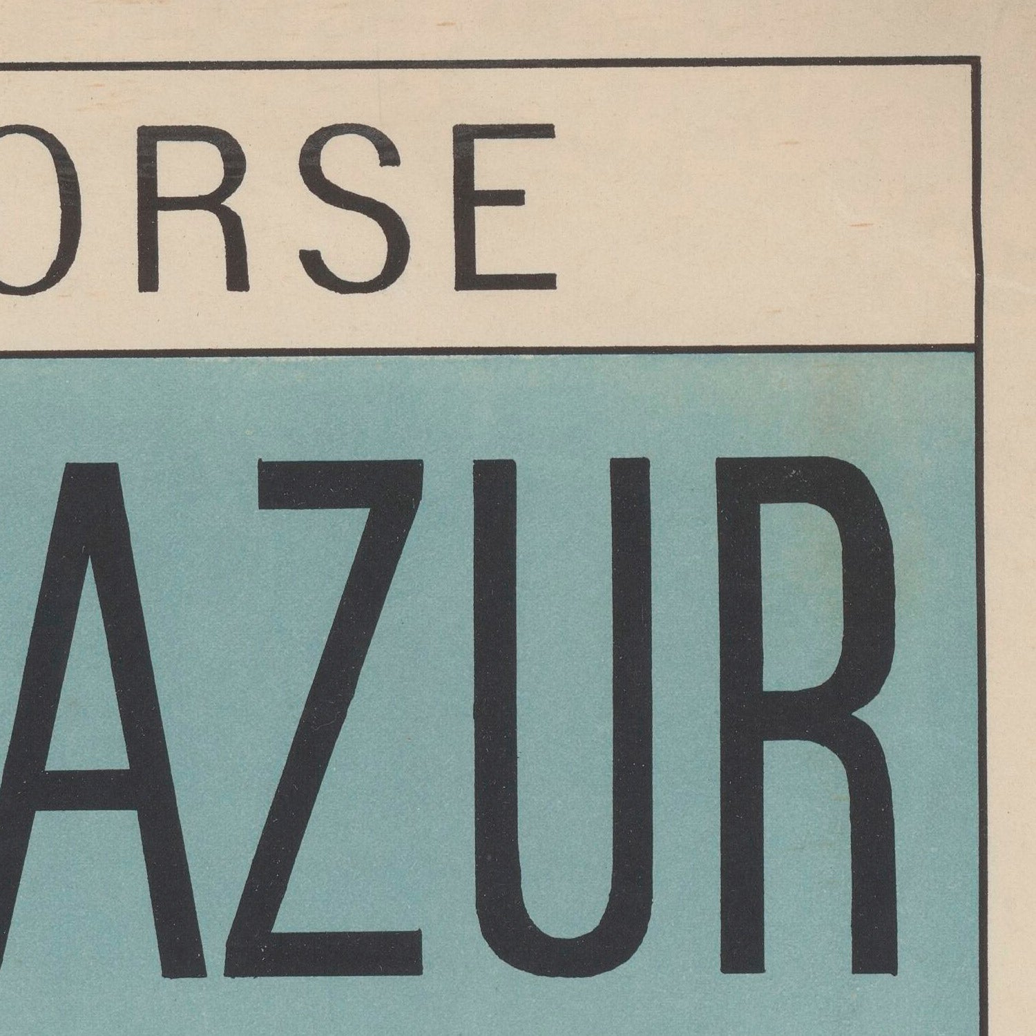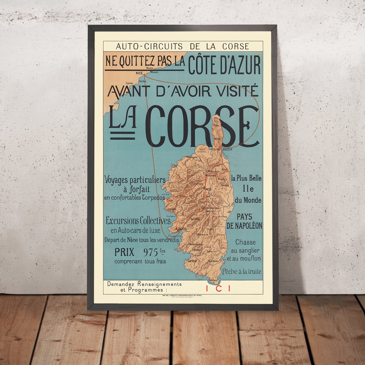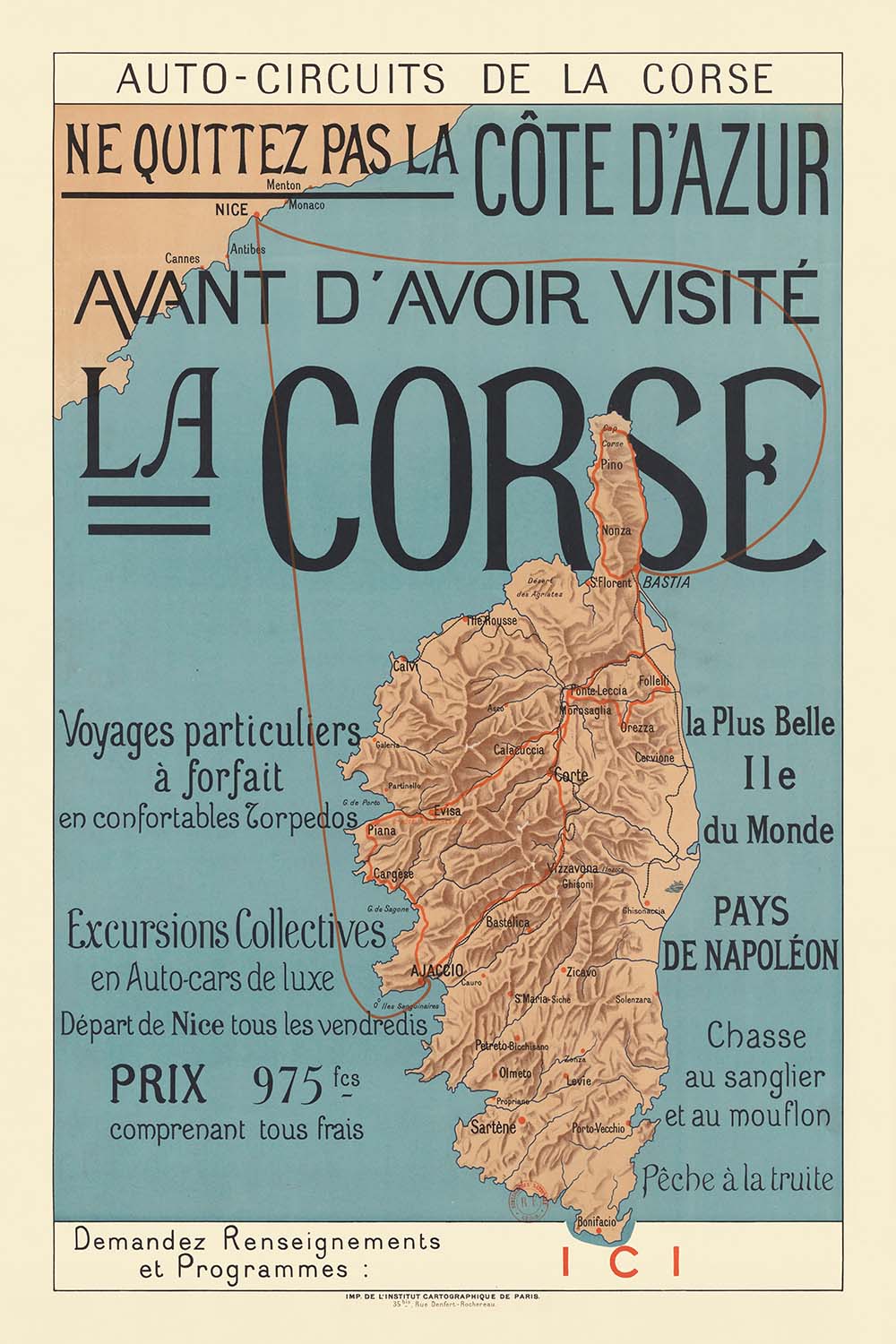 Ne quittez pas la côte d’Azur avant d’avoir visité la Corse, literally "Don't Leave The French Riviera Without Visiting Corsica," created in 1922 by an anonymous French studio artist, captures the golden age of Mediterranean tourism when elegant posters lured Riviera holidaymakers to extend their journeys across the sea. Framed by the sinuous, decorative language of late Art Nouveau, the composition marries romance and clarity: Corsica sits proudly at center stage, routes sweeping around it, and crisp French lettering inviting travelers to discover the island’s storied shores—“Pays de Napoléon” among its historical enticements.