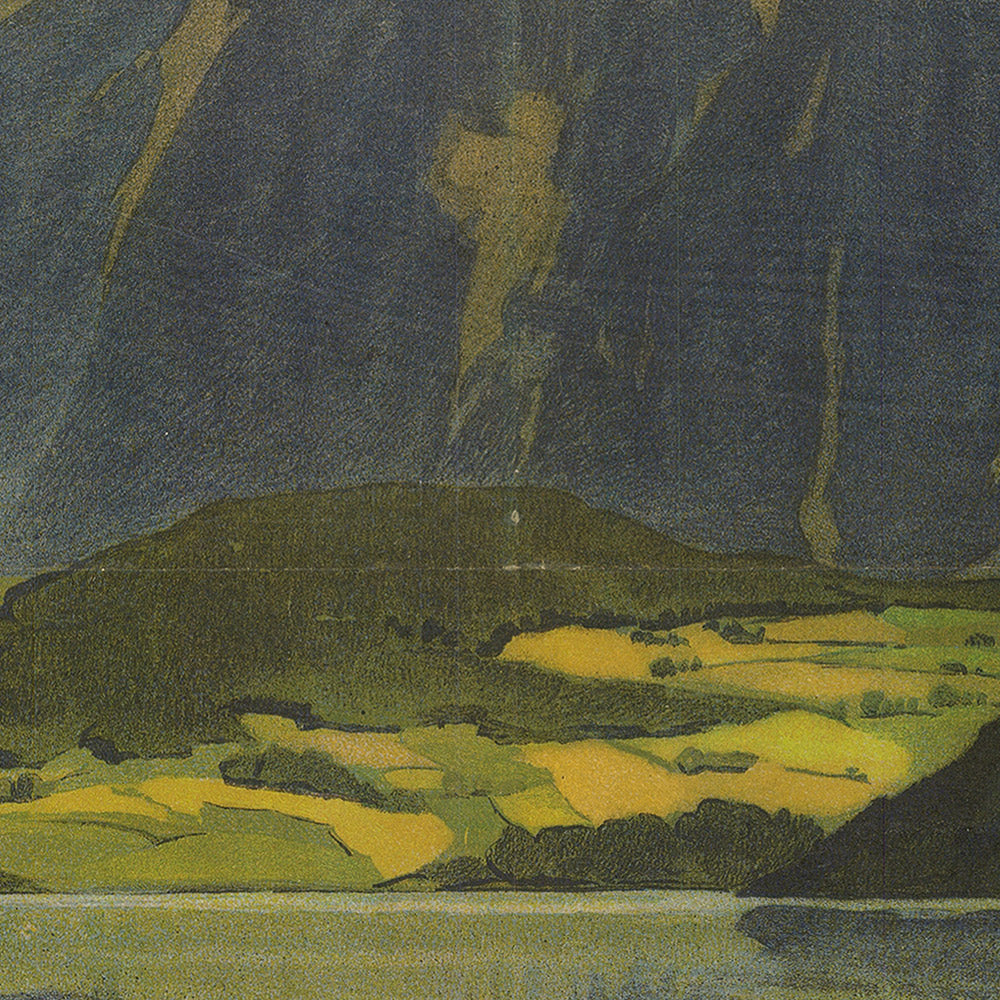 Reckziegel’s palette—soft blues, crisp whites, and grounded greens—creates a luminous, high-altitude calm. Gentle gradients model the mountain’s planes and the lake’s reflective sheen, while simplified silhouettes and minimal typography signal the era’s move toward clarity and function in commercial art. The balanced geometry of the peak, offset by the lake’s supple curve, gives the print a timeless compositional strength that works beautifully in contemporary interiors. If you love classic Alpine vistas, early 20th-century design, or the romance of European rail and funicular travel, this is a striking piece to own.