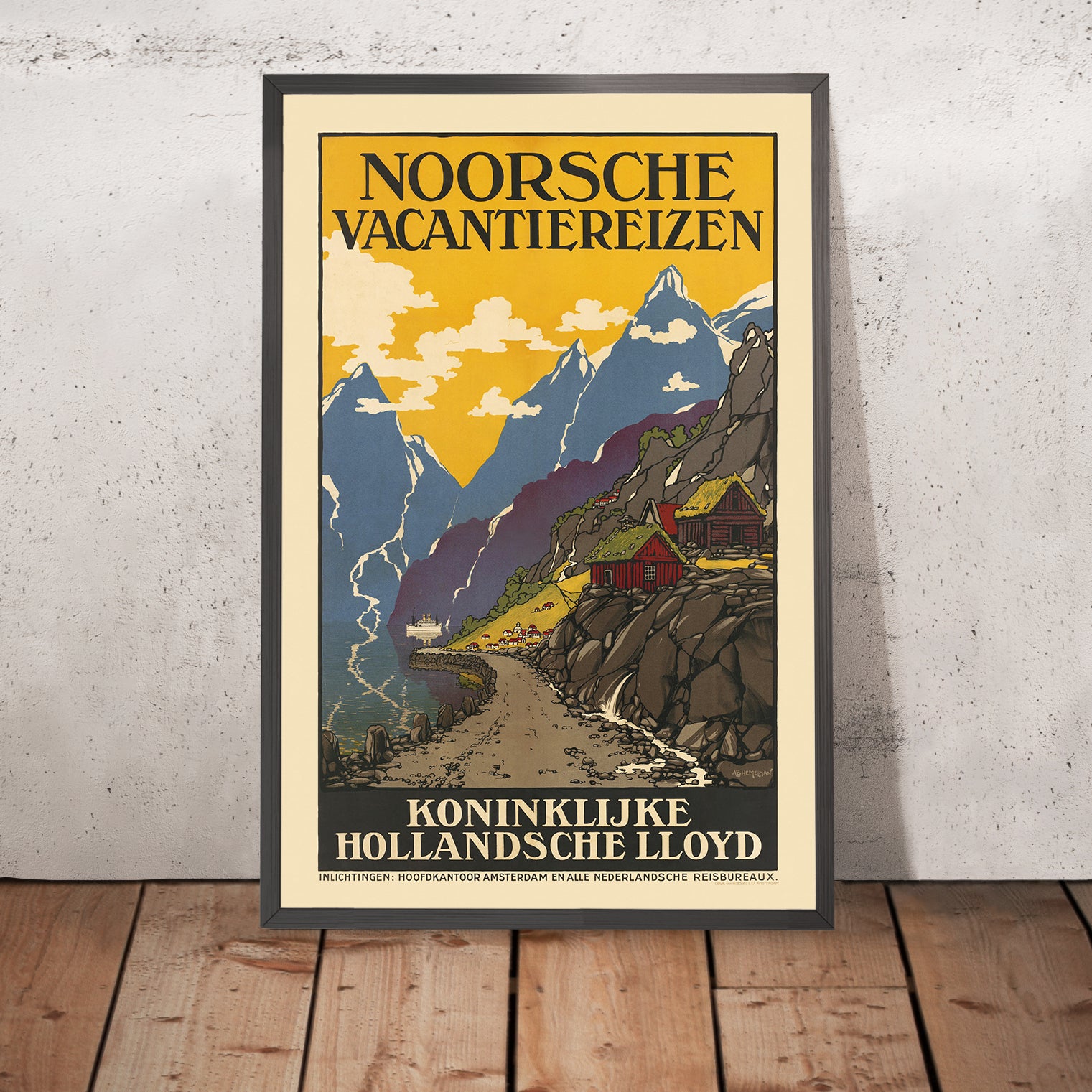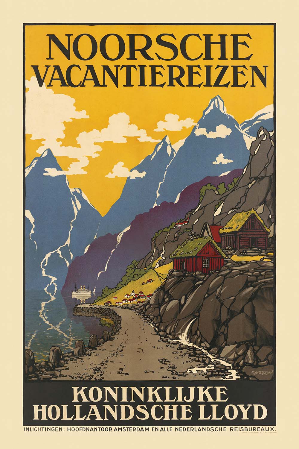 Noorsche Vacantiereizen by Albert Hemelman (1926) captures the romance of early European tourism with a boldly stylized view of Norway’s mountains, water, and clustered village rooftops. Designed in the high Art Deco idiom, Hemelman’s composition distills the drama of the Norwegian landscape into crisp geometry and luminous color, inviting Dutch holidaymakers of the 1920s to discover fjords, fresh air, and far horizons. Its Dutch title—meaning “Norwegian Vacation Travel”—speaks directly to the era’s growing appetite for leisure journeys north.
