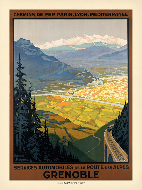 Grenoble. Services automobiles de la route des Alpes by Roger Broders is a classic Art Deco travel poster that invites you to the gateway of the French Alps. In streamlined forms and confident color, Broders captures Grenoble’s modern momentum as motor-coach routes opened the high country to a new generation of travelers. Created in the early decades of the 20th century, this poster reflects the excitement of modern tourism at a time when technology and alpine grandeur were meeting on newly built roads and rail alignments.