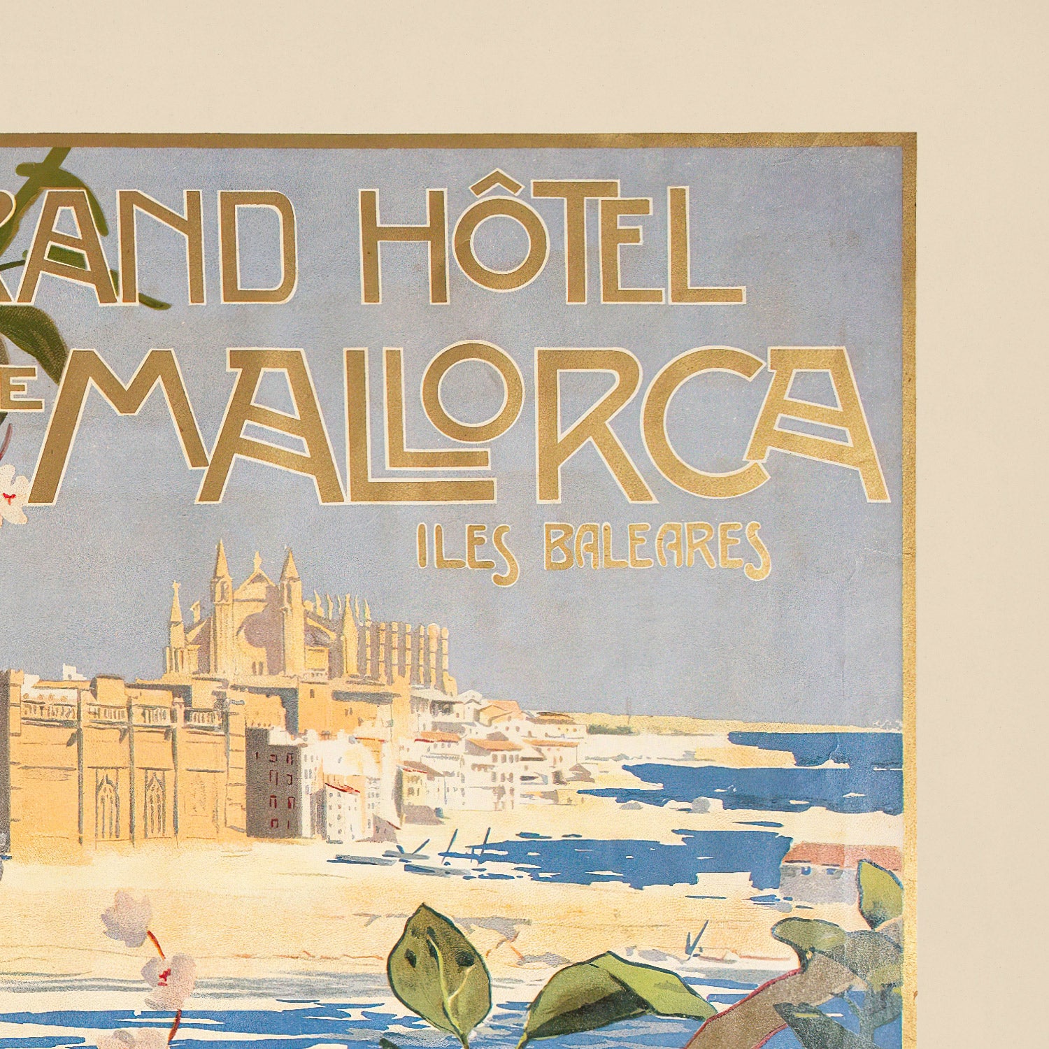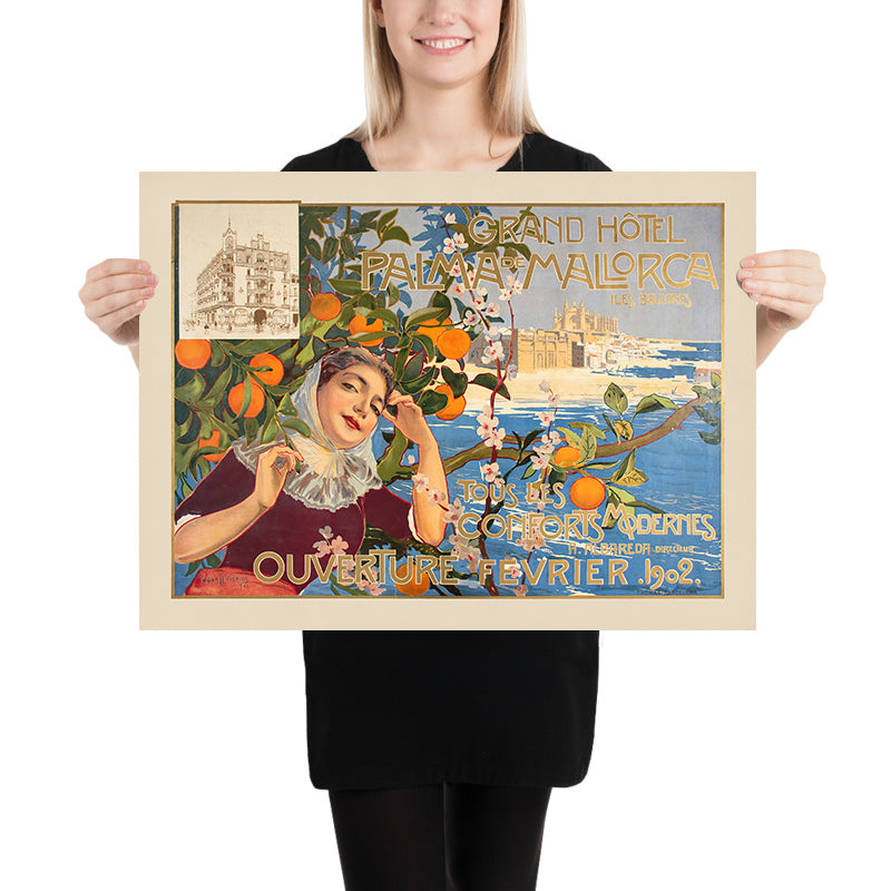 The Grand Hôtel poster is anchored in the early days of Mediterranean tourism, when steamship routes, fashionable hotels, and refined urban promenades brought new visitors to Palma. The composition alludes to local pride—suggesting the city’s architecture, lush gardens, and seaside leisure—while the poised, serene figure personifies Mallorca’s timeless hospitality. More than an advertisement, it’s a snapshot of the island’s belle‑époque optimism and the rise of travel as a cultured pastime.