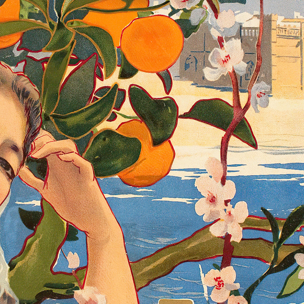 Color and design are the heart of this piece. Vivid oranges, cool sea blues, and leaf‑toned greens are woven into an organic tapestry of circular fruit forms and sinuous foliage, classic Art Nouveau devices that feel at once decorative and deeply natural. The stylized citrus—recognizable as sweet orange (Citrus sinensis)—pops against tranquil blues evocative of coves and bays, while the lettering integrates seamlessly with the imagery, a hallmark of turn‑of‑the‑century poster art. It’s a print you’ll want to live with: warm, inviting, and endlessly evocative of languid afternoons and seaside light.