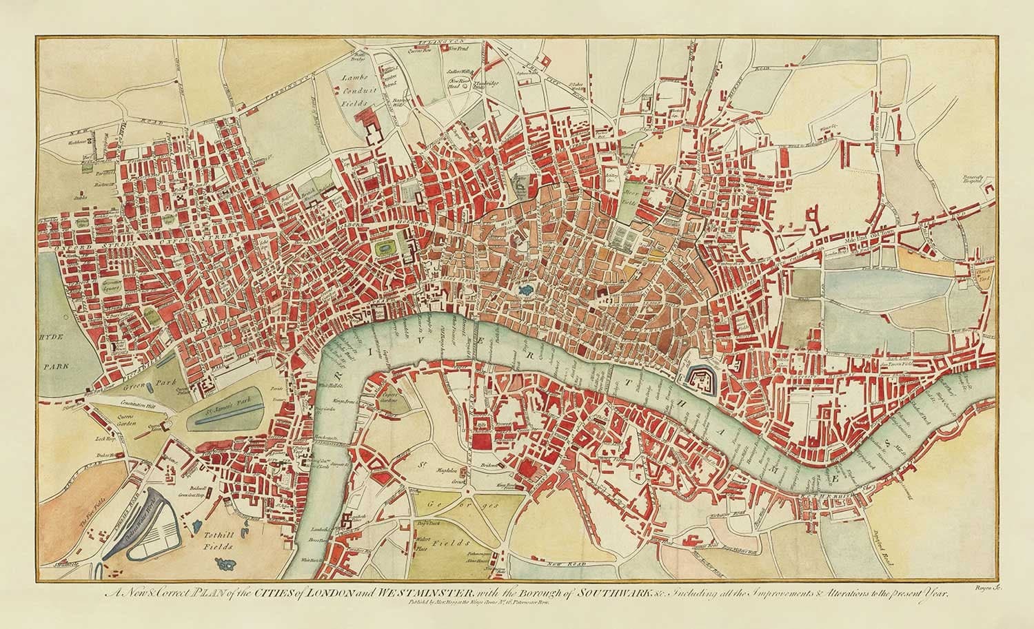 Molti dei luoghi di interesse che sarebbero stati tracciati nel XIX secolo mancano - ma molti erano già stati eretti nel 1784, inclusi la Cattedrale di St Paul, il British Museum, la Torre di Londra, Piazza St James (e ciò che sarebbe diventato Buckingham Palace proprio lungo la strada).