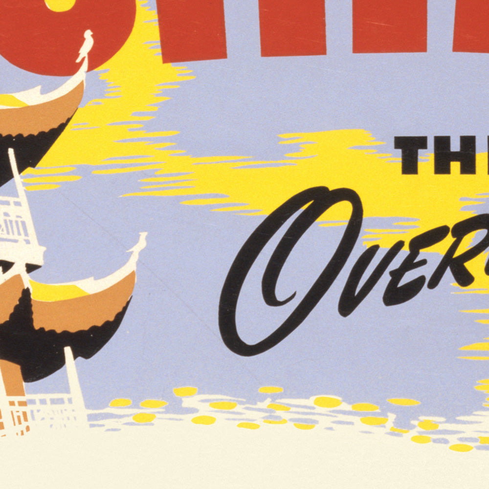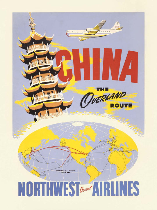Historical interest: The phrase “the overland route” referred to Northwest’s Great Circle path across northern latitudes—more land, less open ocean—bringing the Far East tantalizingly closer to North American travelers. In 1950, the idea of flying to China still carried the allure of the Silk Road and merchant caravans, yet it was newly accessible to business and leisure passengers. This poster bridges that duality, evoking both age-old mystique and cutting-edge flight technology in a single, collectible image.