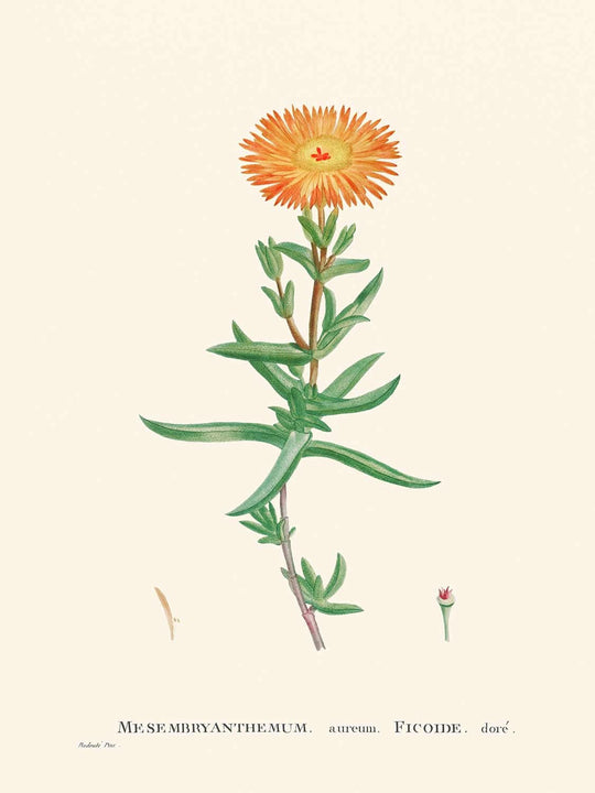 Il Fico d'Oro-Margherita di Pierre-Joseph Redouté è una straordinaria illustrazione botanica vittoriana che cattura magnificamente l'essenza del suo soggetto, il Mesembryanthemum Aureum. Pierre-Joseph Redouté, rinomato per la sua meticolosa attenzione ai dettagli e abilità artistica, creò questo capolavoro nel 1802 durante un periodo prolifico della sua carriera mentre dipingeva la squisita flora del Château de Malmaison su richiesta di Giuseppina Bonaparte, moglie di Napoleone.