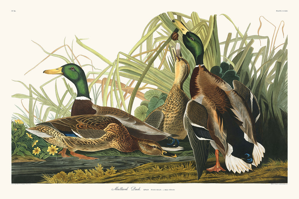 L'illustrazione "Anatre Mandarino" è notevole per la sua accuratezza scientifica e l'eccellenza artistica. Curiosamente, Audubon notò che, contrariamente alla credenza popolare, le anatre mandarino erano piuttosto rare in alcune parti degli Stati Uniti durante le sue osservazioni. Questo particolare pezzo non solo mostra la bellezza di questi uccelli, ma offre anche uno sguardo sulla loro distribuzione e comportamento come notato dallo stesso Audubon. Il contrasto sorprendente tra i verdi vivaci dei maschi e i marroni sottili delle femmine aggiunge profondità e realismo alla composizione.