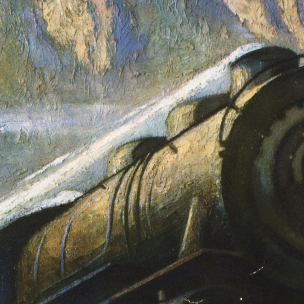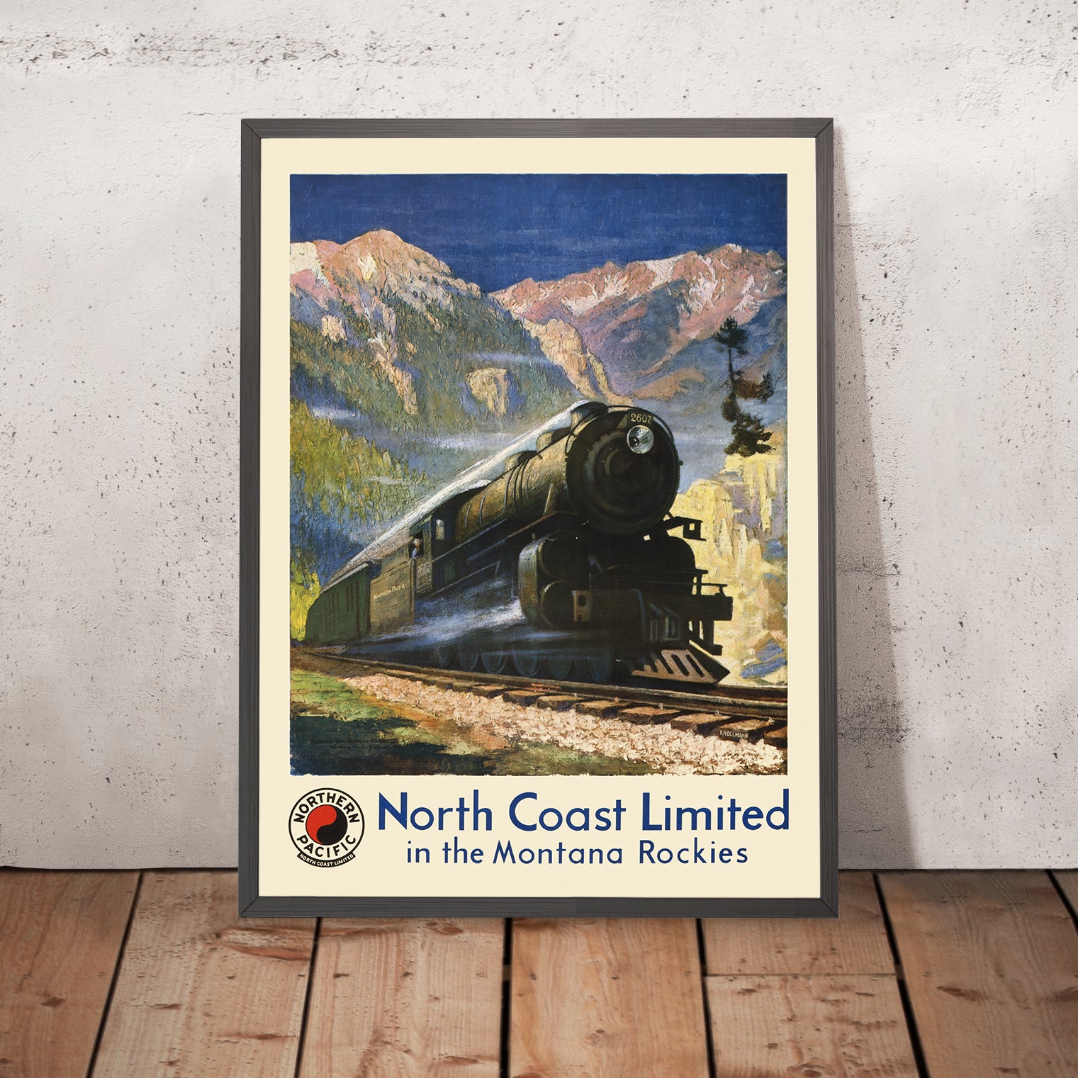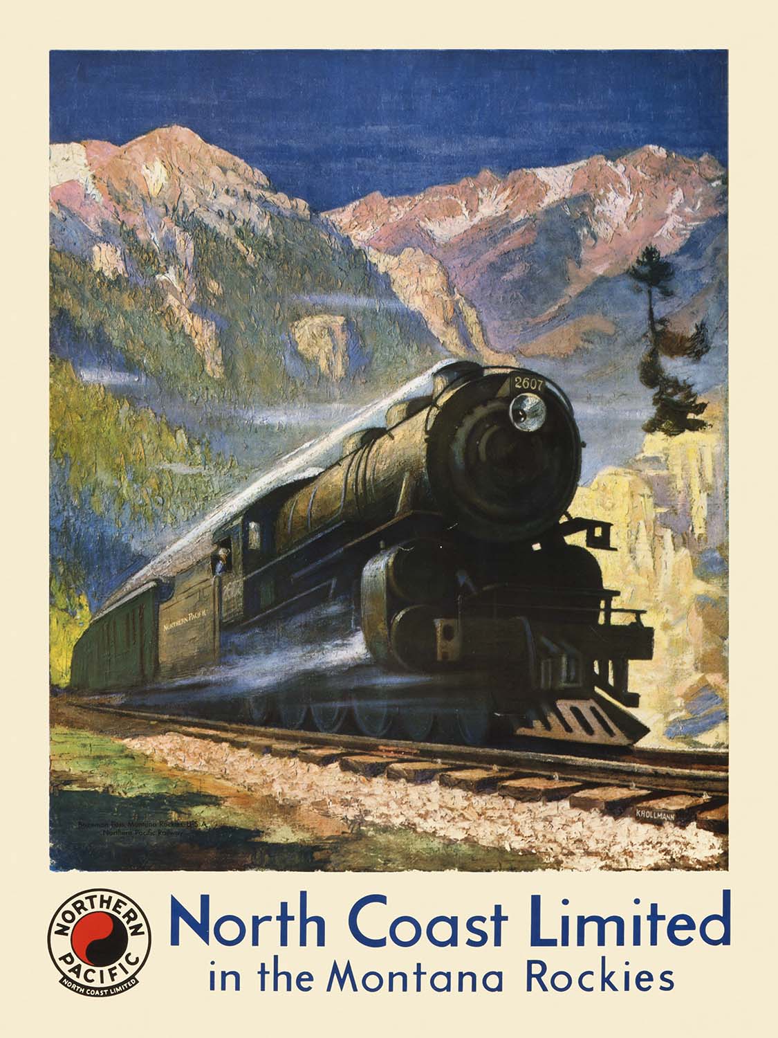 Krollmann’s composition balances the geometry of industry with the organic sweep of landscape. Deep, confident blues dominate the sky and steel, while evergreen slopes and forested ridgelines glow in saturated greens. Notes of warm yellow and ochre gild the valley floor and sunlit outcrops, bridging the cool tones of atmosphere and the locomotive’s crisp silhouette. Sleek, streamlined contours and smooth, polished surfaces convey speed and modernity, while softer, textured passages in the peaks and foothills honor the natural beauty of the Montana range. The dynamic perspective invites the eye forward, making the train feel alive and in motion—an effect as effective today as it was for travelers a century ago.