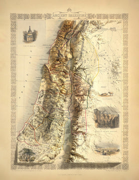Intorno ai bordi della mappa ci sono incisioni dettagliate, meravigliosamente colorate a mano, di luoghi importanti come la Tomba di Assalonne, la Chiesa del Santo Sepolcro e Nazareth.