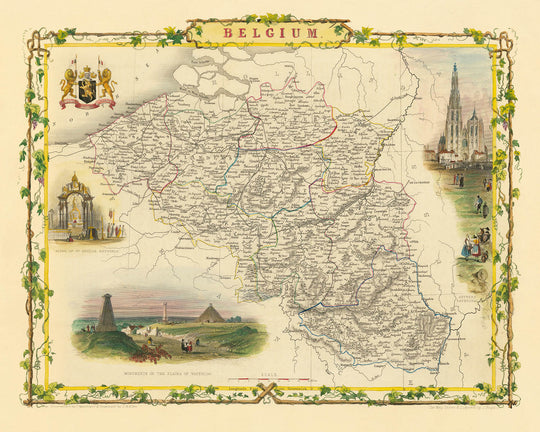 Forse più affascinanti sono i vignetti colorati a mano che abbelliscono i margini della mappa, ognuno catturando un momento o un monumento di significato nazionale. L'Altare di St. Gudule a Bruxelles, le torri svettanti della Cattedrale di Anversa e i solenni Monumenti delle Pianure di Waterloo sono tutti rappresentati in delicati pastelli. Queste illustrazioni servono da finestre sul patrimonio spirituale, architettonico e militare del Belgio, offrendo una narrativa visiva che completa il dettaglio geografico della mappa. Tali abbellimenti sono tratti distintivi dell'arte di Tallis, elevando la mappa da strumento di navigazione a artefatto culturale.