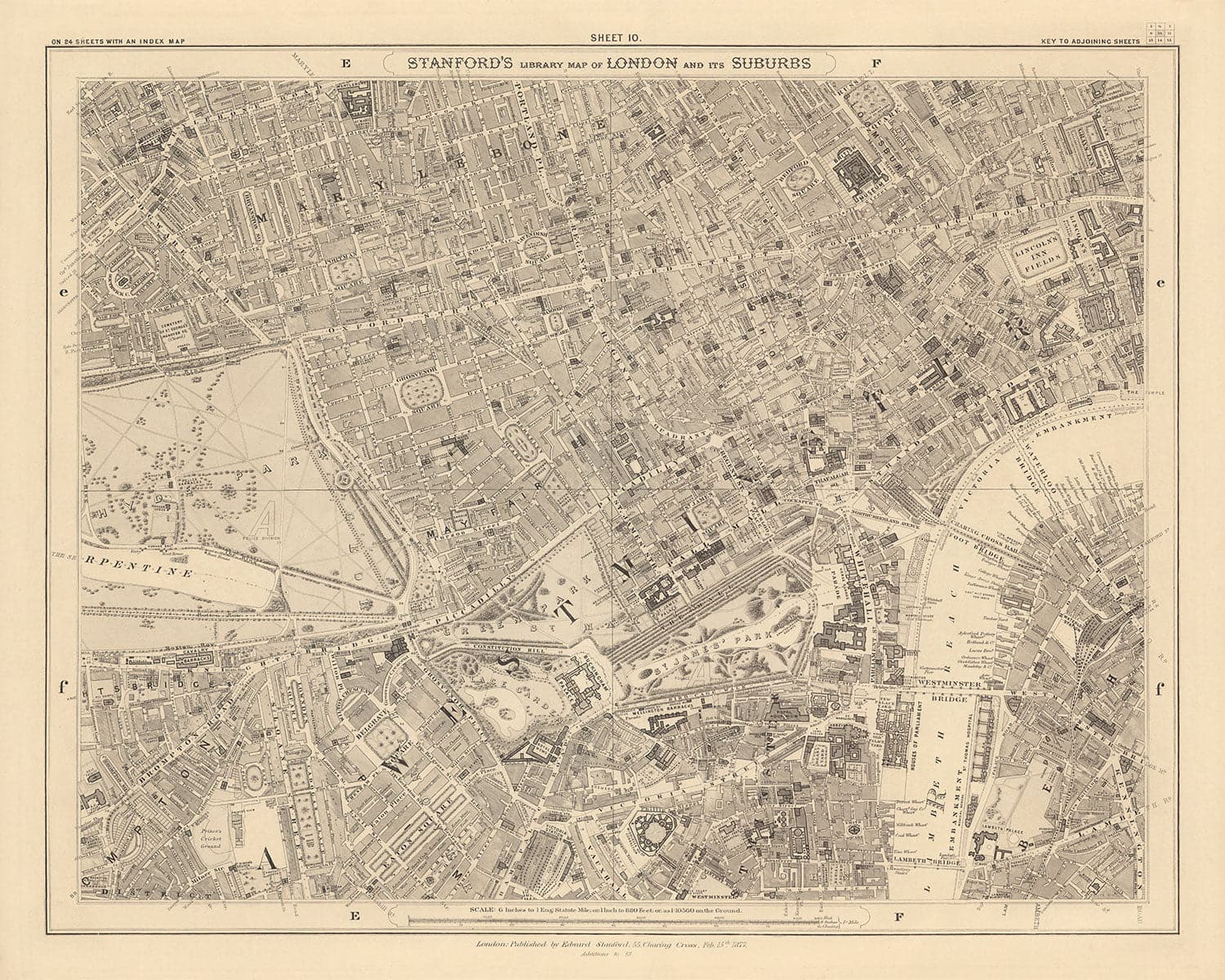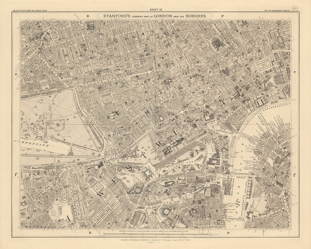 La mappa è stata originariamente pubblicata in 24 fogli. In totale la mappa avrebbe misurato circa 2 metri di larghezza (78 pollici). Questa qui è il foglio 10, che si concentra sul quartiere centrale di Londra di Westminster e su parti di Lambeth.