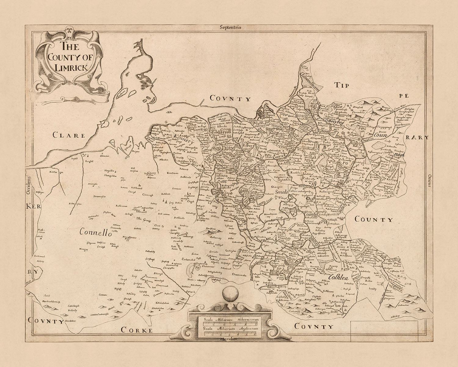 Questa mappa della Contea di Limerick, pubblicata nel 1685 da Sir William Petty, è una mappa politica e fisica dettagliata che fornisce una ricchezza di informazioni sulla contea e sui suoi dintorni. La mappa si basa sul Down Survey of Ireland, che è stata la prima indagine dettagliata della terra su scala nazionale in qualsiasi parte del mondo. L'indagine è stata guidata da Petty, che era un chirurgo generale nell'esercito inglese e una figura prominente nel campo dell'economia politica.